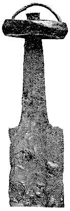 Moreover, there is a single sword, the previously mentioned T 1441 from Krokstad, Melhus [fig. 81], where, of the guards, only the upper guard has been preserved. This guard is of bronze and is lacking a pommel. Instead there is fastened, in the rivet-holes on the upper hilt, a simple iron hoop made of one single rod flattened on both ends. The same is the case with a Swedish sword from Dalarne (Uppsala, Inv. -nr. 1043). However, the guards are narrower and more slender here, which in many respects makes it similar to sword C 4979 from Homerstad, Stange, Hedemarken (fig. 135). It will be discussed in a separate entry.