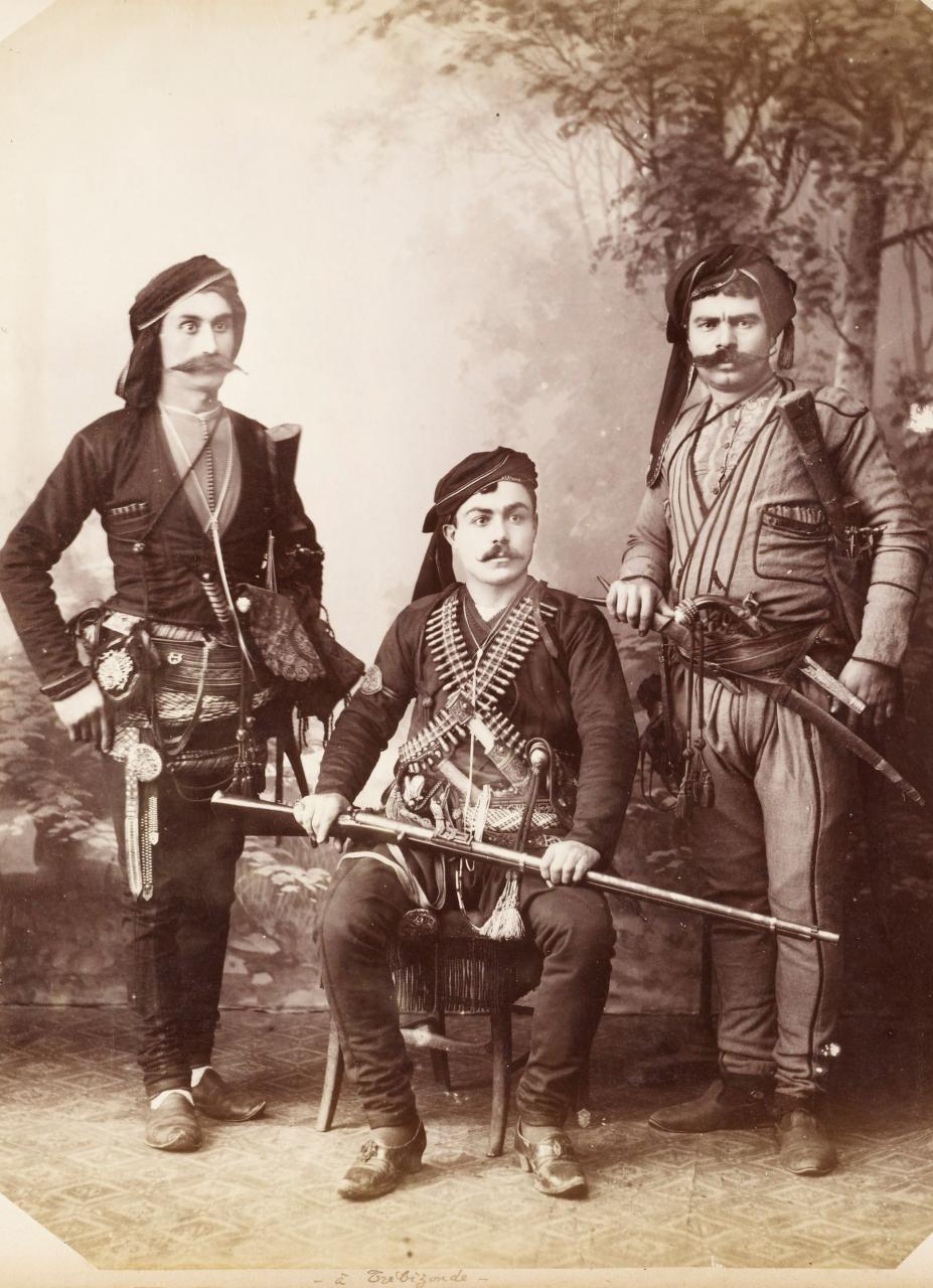Men from Trabzon armed with Yataghans, ball butt flintlock pistols, Shishane with strange shoulder holsters, and Russian Berdan No.1 |