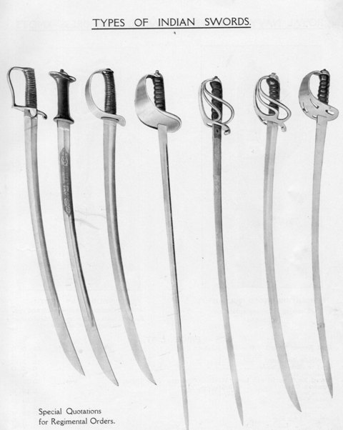 Actually that is indeed an Ethiopian shotel with the European type blade, if I am correct on terminology. I have understood the 'gurade' as typically the stirrup hilt military style sabres for Ethiopia (usually German made). In the early 20th century, Wilkinson Sword Co. had been supplying then Abyssinia with swords for a time, and these catalogs listed their wares. Other similar pages illustrate Ethiopian blade variations for the traditional rhino horn 'shotel' which included both the deeply curved sickle type as well as the shallow curve military style. Both were used into the 1930s. It is curious how this became mixed in with the Indian grouping, but in these times it does not seem uncommon for such interpolation in many references and in this case catalogs. I once had a pair of British made tulwars (by Mole, contracted to Wilkinson) which had cast brass Indo-Persian hilts. These were quite true to form, and the British were quite attuned to such details. Native cavalry during the Raj were permitted to choose their favored weapons it would seem, as there are variations by regiment and some had traditional tulwars. Since the term tulwar was of course a general term for sword, and equally used to refer to the European style sabres in these regiments, it is unclear exactly what the actual form was. |