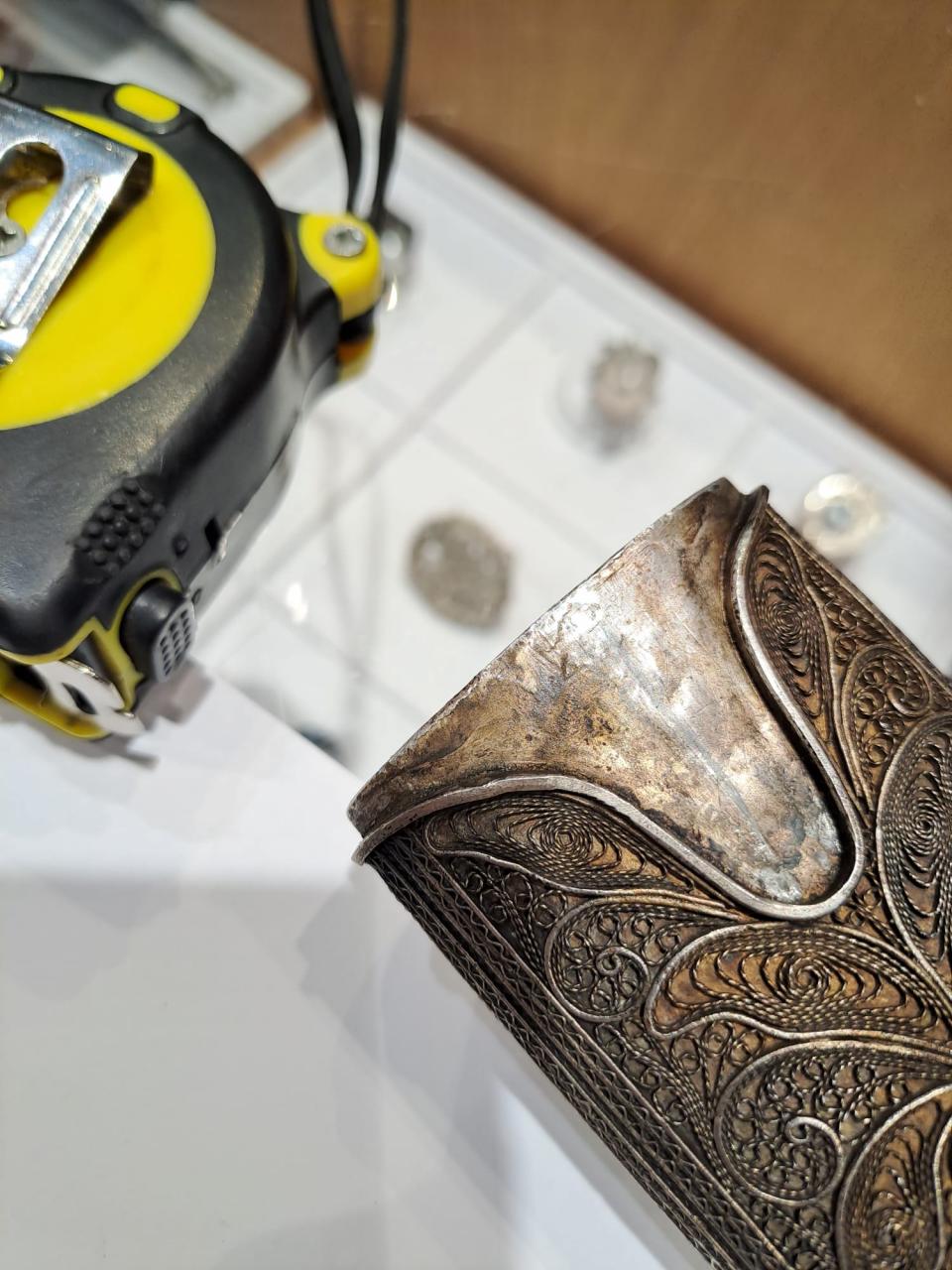 There are a few oddities about this piece compared to other saifs, that includes thicker silver dress and the use of deer horn. The original was in a very rough shape, basically crumbles when held so the maker got a new horn and made it in exact dimensions. Everything was perfect except for a simple discolouration that I thought is acceptable since its natural. |