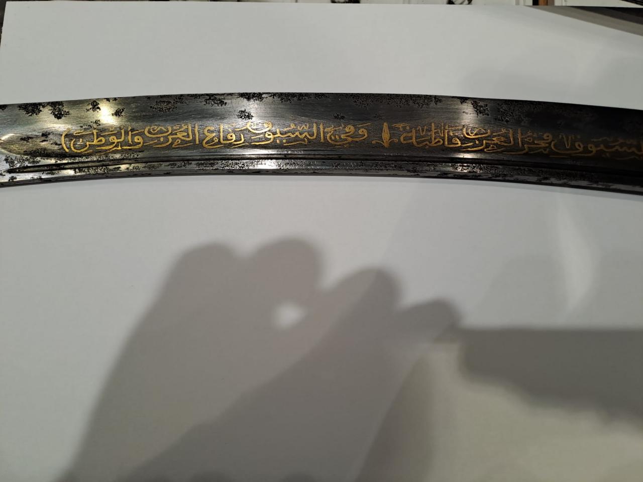 Would someone be willing to confirm the determination of this saif saber? Attachment 227370 It seems to be a 20th century production. An Arab friend helped me translate the inscription on the blade: ،،، السيف عزة مجد أنت قابضها ،،، ،،، وعزة المجد لا تأتيك بالوهن ،،، ،،، ففي السيوف دفاع العرب والوطن ،،، The sword is the height of glory, O bearer, and in the height of glory you shall not be wearied; as the sword is the pride [defender] of all the Arabs, and the sword is the defender of the Arabs and the homeland. Attachment 227367 Attachment 227368 Attachment 227369 What is curious is that it has the number 4 stamped on the crossguard and the sheath which could indicate a more industrial production? The grip seems to be plated with a sort of plastic, which the author says smells like pinewood when burnt? :confused: Attachment 227365 Attachment 227366 What do you guys think. Also do you have any indication on the worth of such sabers? Thanks! |
