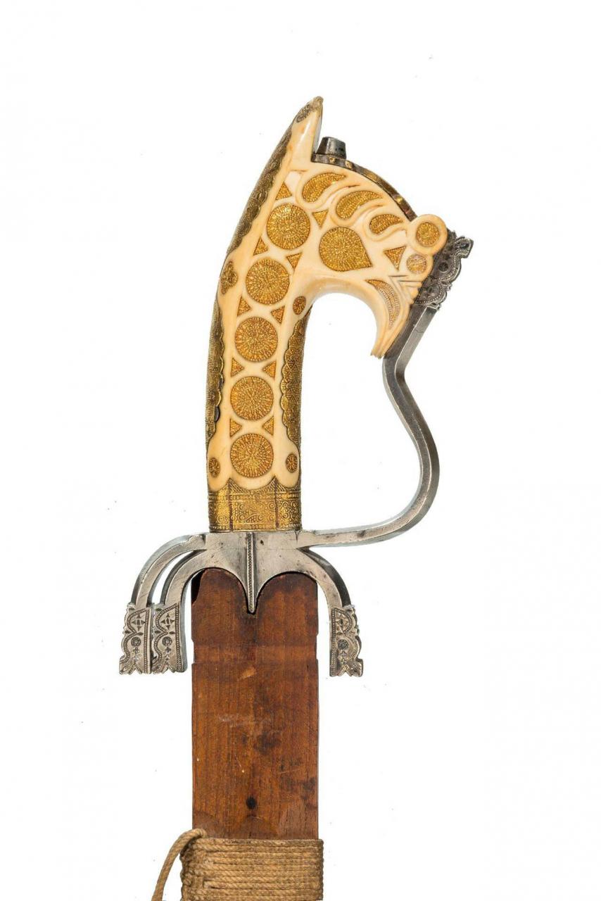 Attachment 235227 Just adding a few words about the applied decoration and what I have identified as a sort of Royal Signature on Omani and Zanzibari weapons... and this work applied using quite rudimentary equipment either stitched onto leather or hammered onto steel hilts/quillons though not onto all the examples which suggests to me that those VIP richly decorated swords may well have been presentation items and or high ranking business owners or Officers in the Omani Navy. Those swords of a lesser grade / munitions grade probably not so lavishly adorned nevertheless a degree of transfer identified in common design style. I tend to see some potential copying from the main style in Ottoman style plus style from other previous Omani types as well as unusual additions such as the Turtle motiff...and with a regional probably inexpensive blades ...and the black leather Scabbards complete with a sworl pattern. The apparent horses head hilt when finished in Ivory and gold imported from African trade operations into Zanzibars artesan workshops Joins the array of incredible designs and the broadened bottom third points at Malibari style seen on Moplah. |
