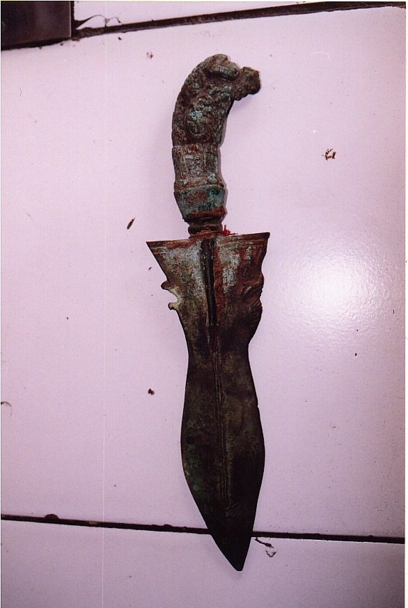 Anyway--- ferric material corrodes much more quickly than brass or bronze. Most of the genuine old excavated bronzes that I have seen have been fairly thin and light, and mostly seem to be filled with a clay-like substance, rather than jabung or damar. The smooth parts of the material are very smooth and have nice even, dark patina.Old bronzes in general have a very refined, "gentle" feel to them---something that is difficult for me to put into words--- its almost as if when hold the object you can feel the age.This handle of yours just looks too heavy and unrefined. I could be 100% wrong, I'm no expert on bronzes, but to my eye it just doesn't look like genuine stuff I have seen and handled. If the price approximated ivory, that was probably not high enough. I have seen quite small , genuine bronzes change hands within the trade, in Jawa, for very impressive money.Something else too:- can you still see the lines of the cast and has the surface been well finished after casting? If you can still see the joints and there has been minimum finishing it is certain to be modern.Have you tested the material? Brass or bronze? If brass it is modern. After more than 40 years of buying things in Indonesia, I no longer take a great deal of notice of the "supporting evidence" when I buy. Anybody dealing on even the lowest commercial level knows what they can get for their goods, and the way something is presented --- for instance, with adhering deposits, or stubs of corroded iron--- is just so much window dressing. |