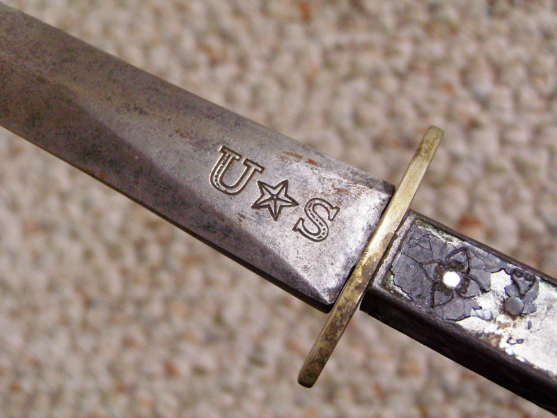 He dates this particular knife to having been made between 1847 and 1849, presumably due to the etching on the reverse, which has an inscription commemorating the (U.S.) victory at the Battle of Buena Vista (by the early 1850s, Mexican-American War-themed inscriptions had been replaced by Gold Rush, abolitionist, and secessionist themes). Made by and marked to Sheffield cutler C. Barnes (relation to Edward Barnes unknown). Not only does the inscription appear in a sans serif font, but the ricasso is stamped with the maker's mark in which the last line "SHEFFIELD" is clearly stamped in a sans serif font as well: |