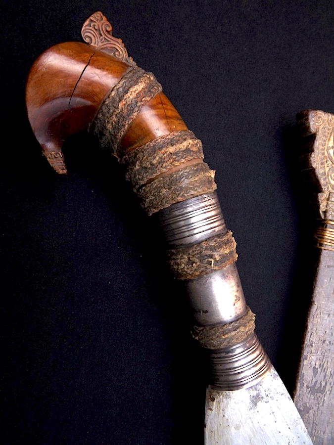 #2 IS OF A OLDER FORM OF ITS TYPE, ITS FORM AND CONSTRUCTION MAKES ME SUSPECT PRE-WW2 NOT POST. POST WW2 OFTEN HAS WIDER STRIPS OF FIBER WRAP ON THE SCABBARD AND ALUMINUM IS A MORE COMMON FERRULE AND BANDING MATERIAL. THE WORN BANDS ON THE GRIP ARE A OLDER CHARACTERISTIC TOO. IN THE END WHO KNOWS WITHOUT GOOD PROVENANCE. AS TO THE QUESTION WHICH WOULD I CHOOSE ? I AM SOMEWHAT FICKLE AND GO WITH WHAT ATTRACTS ME MOST ON MAKING SUCH A SELECTION, SO WITH BOTH ITEMS IN HAND IT COULD GO EITHER WAY. JUST FROM PICTURES IF PRICES WERE COMPARABLE SAY ON EBAY I WOULD LIKELY GO WITH #1 AS I DON'T HAVE ONE LIKE IT. |