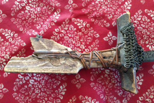 There are a number of tip configurations. This plain one is perfectly legit. The mansala is usually tied to the gripping area and is used to secure the grip of the main hand in battle. Based on the large holes in the crosspiece, I believe it's fair to assume that it once held the usual metal staple, probably a single one only. BTW, what's the blade length? Regards, Kai |