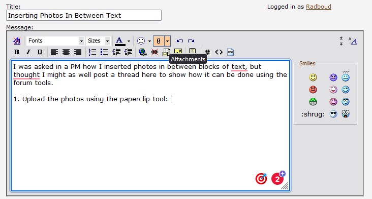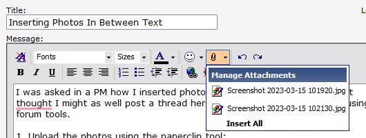 1. Upload the photos using the paperclip tool: Attachment 225102 Attachment 225103 2. In your text, click on where you want to insert the image and click on the little inverted triangle next to the paperclip to manage the attachments: Attachment 225104 3. From the Manage Photos list, double-click on the image you want to insert: Attachment 225106 4. Your text should look like this, with each number representing a different image: Attachment 225107 5. After editing your text, just 'Submit Thread' as usual. |