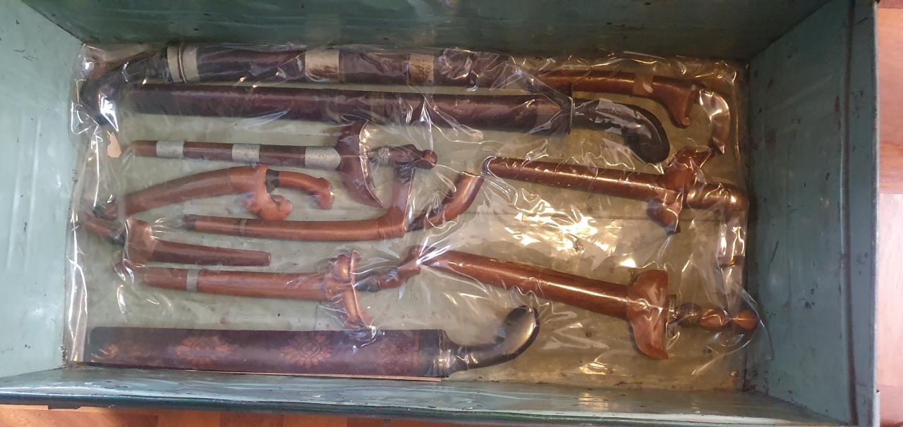 Last Tuesday I received an open message on facebook, it is still there, that after his mother past away, she was Indonesian, Lampung, his father was Dutch, they found a box with 11 pusakas. They all forgot about the coffin after decades and found it on the top of the house. Opening the coffin, the gentleman suddenly remembered that strange things indeed happened in his youth, such as his father who got a deep cutting on a keris, and when one of the keris inexplicably fell off the wall, ending up right between his fathers toes, the father decided to lock up the kerisses, and it stayed there for 70 years... The gentleman did not dare to remove the plastic from the kerisses, of what he remembered of the keris and I smelled the camphor smell of my youth!!! Opening it was even for me like going back in time...
