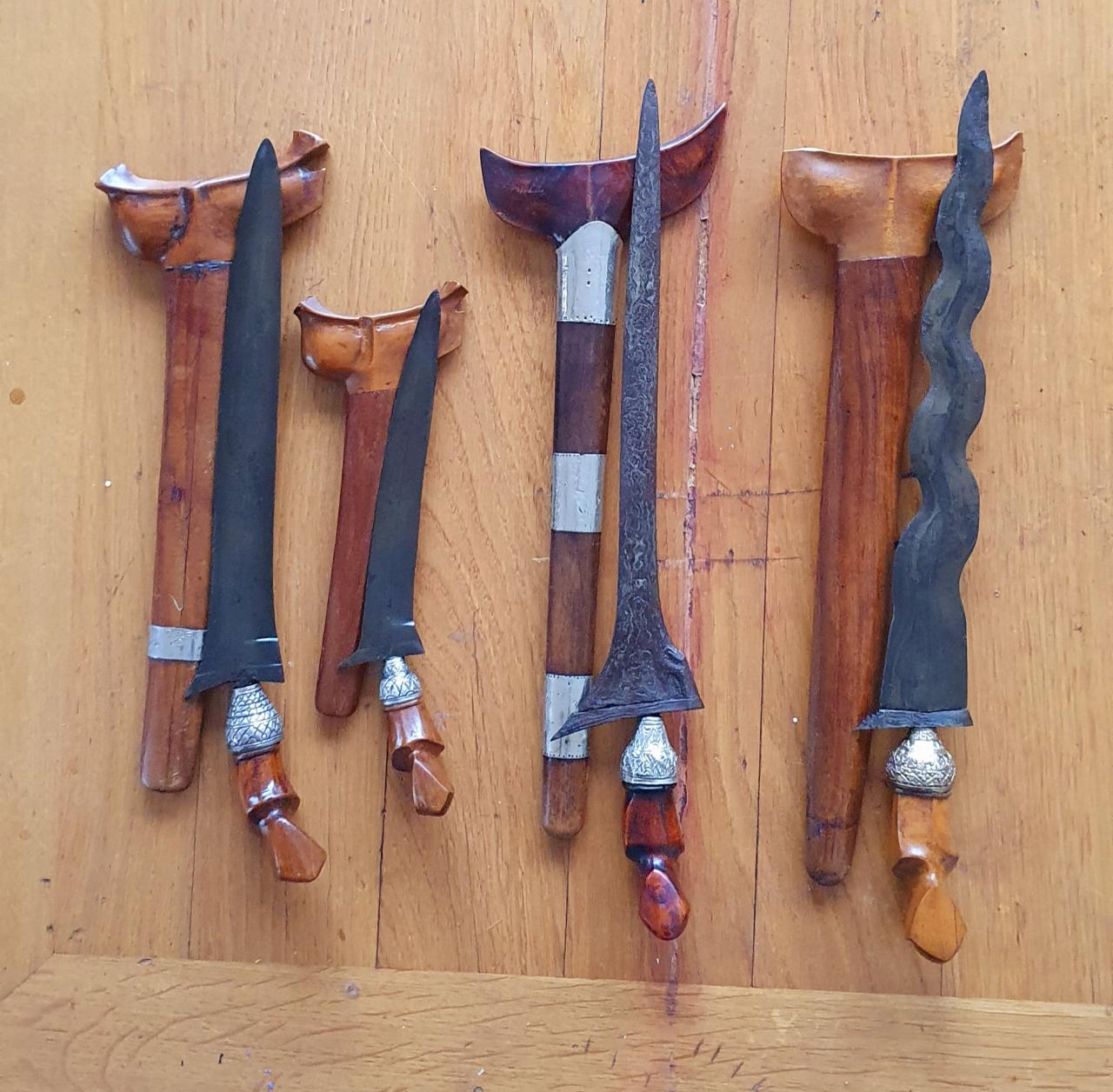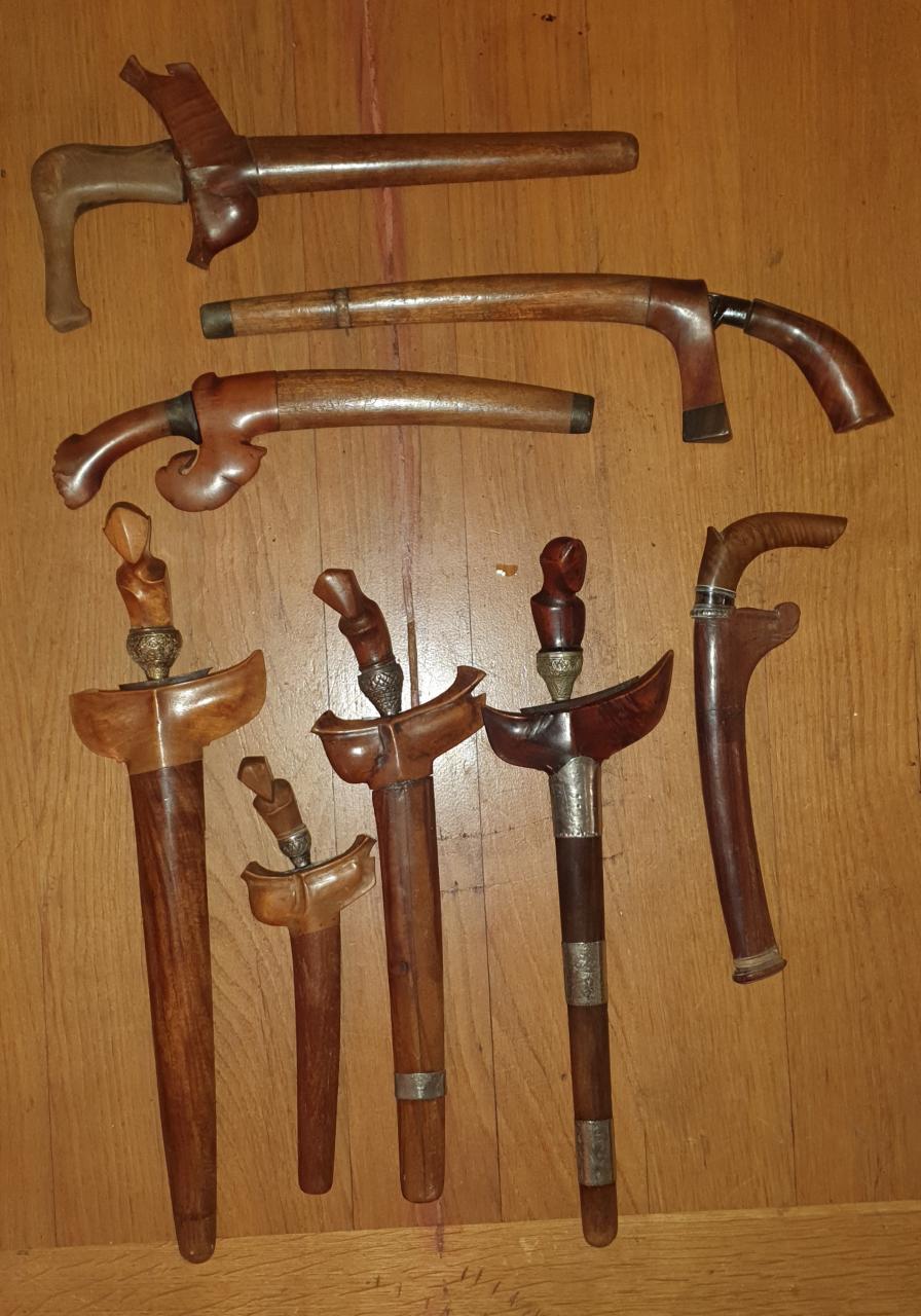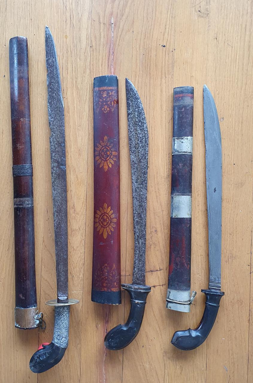 I'd guess that the keris on the right never was a tombak but started its life similar as the 2 on the left side. This is a known style from southern Sumatra that seems to have developed during the late colonial period - not sure when the first example got documented. Good to have additional evidence - thanks for posting, David! The second keris from the right looks like a genuine antique blade with also old fittings (except for the scabbard stem and its silver bands which seem to be a later restoration. As mentioned, the 3 swords are typical examples from southern Sumatra. David, can you confirm if the name rudus has also been in use in Lampung? I'm only aware of its use considerably further North (for a different type of blade). I'd like to see the blades of the 4 additional pieces, too. As mentioned, posting these on the main forum would be much preferred. Regards, Kai |