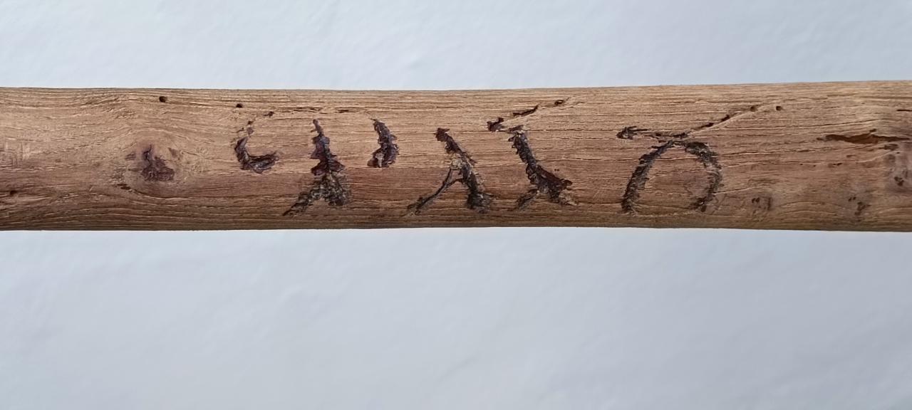 Thanks for the reply. The handle fits perfectly into the iron part, the writing (as you can see from the first letter, a T) seems to be gothic. On the other side of the handle there is another writing, longer but indecipherable, because it is worn. The old age of the handle seems evident to me