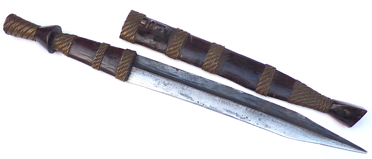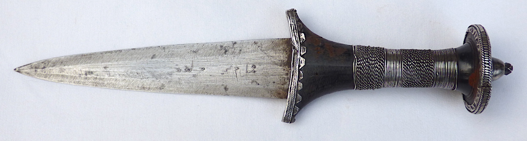 The first is a nice old double-edged dagger with silver mounts on the hilt, a disc pommel and a full length tang peined over the end of the hilt. The blade is double-edged and has an Arabic inscription on one side. OAL 9.75 in. Blade 6 in. Hilt 3.75 in. Attachment 234137 Attachment 234138 Attachment 234139 Attachment 234140Attachment 234141 The second is another double-edged knife in a wooden scabbard bound with segments of wound copper wire. The flattened elliptical wooden hilt has similar wire wrapped bands. The blade on this one is very interesting and is constructed in a way I have not seen before. Think of a blade with a flattened diamond cross-section coming to an acute point. To one side of the longitudinal midline ridge the blade has been hollowed out such that it is concave from the middle to the edge. This is repeated on the other side such that each concave half is backed by a flat half on the other side. In this way, a double-edged knife has been created fairly easily. OAL in scabbard 16.5 in. OAL out of scabbard 16.3 in. Blade 10.5 in. Hilt 5.8 in. Attachment 234142 Attachment 234143 Attachment 234144 Attachment 234145 I'm looking for help in placing the origin of these two knives. |