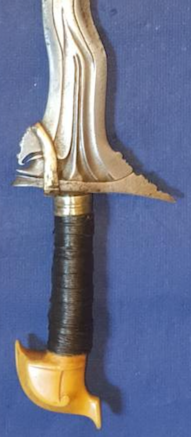 The blade length is 48.0 cm (19.0 in) and OAL is 58.8 cm (23.1 in). The ivory kakatua pommel with side panel is diminutive, measuring just under 3.8 cm (1.5 in.) from tip of the "beak" to tip of the "crest." The scabbard has a nice old banati wood cross piece, but the remainder of the scabbard has been replaced with an unattractive hardwood. The scabbard toe is tilted up and the corresponding smaller back piece has broken off. This is an old scabbard style. Indicators of age are the relatively short blade, the diminutive pommel, and the scabbard style. . |