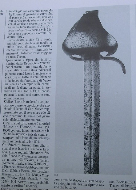 Ulfberth's comment on Italian naval sabers led me down a rabbit hole of naval pattern schiavona's, Fanti del Mar was one word that popped up on a thread from this website. From there I found a number of examples of schiavona's with guards identical to the one on mine, except with completely different pommels and completely different blades. Attachment 239773 Attachment 239774 Attachment 239775 Finally I found one that gave me a bit of a eureka moment, below is an image of a closeup of a guard of one of a marine Schiavona with a Venitian arsenal mark on the guard, the second is my sword: Attachment 239776 Attachment 239777 And there it is! A (probable) Venetian maker's mark on my own sword. So what I have is a guard from one of these Venitian marine swords, with a storta, falchion, dussack, etc, etc blade. So you are both right I believe. |
