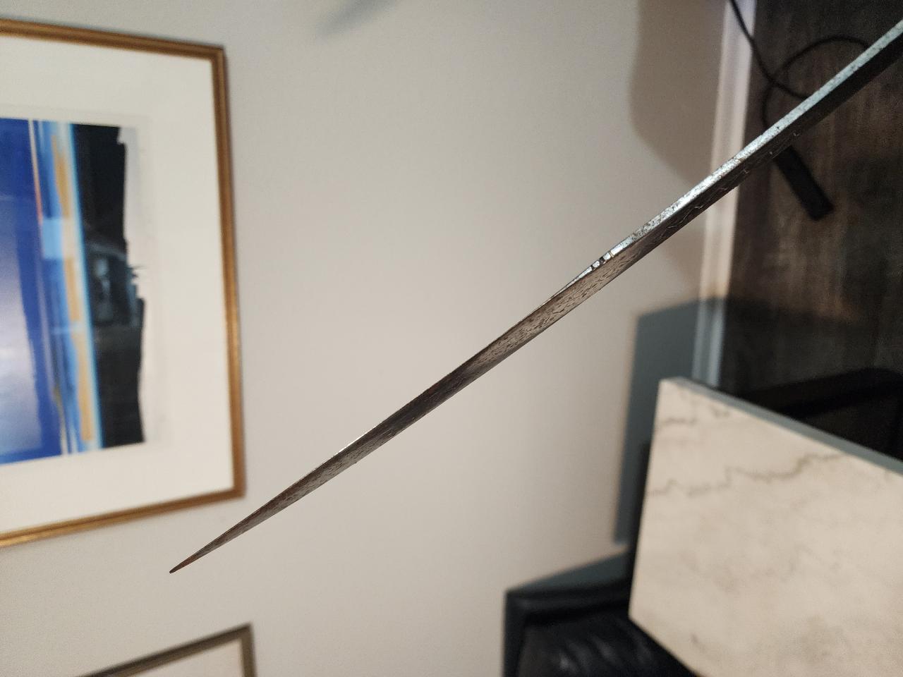 Now the rapier. Incredibly light feeling (which shouldn't be surprising, that's kind of the point). No markings on the blade or stamps on the ricasso. If a stamp is there, it is so light as to be invisible. Blade is forty inches long and transitions from a traditional flat blade to a fine diamond cross section. The thickness of the diamond portion is greater than the flat portion, meaning from the side the thickness actually appears to increase. |