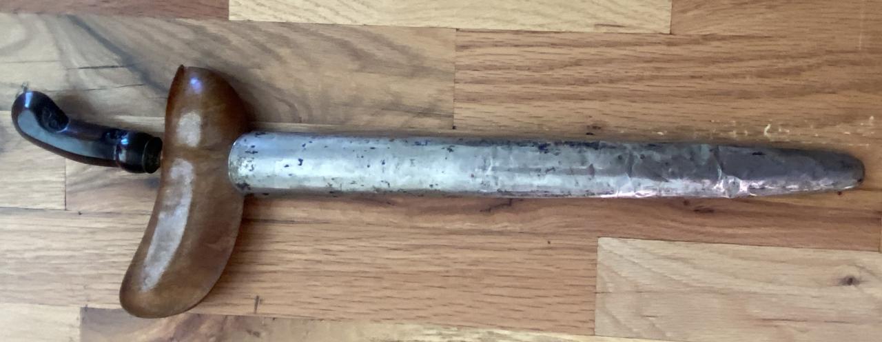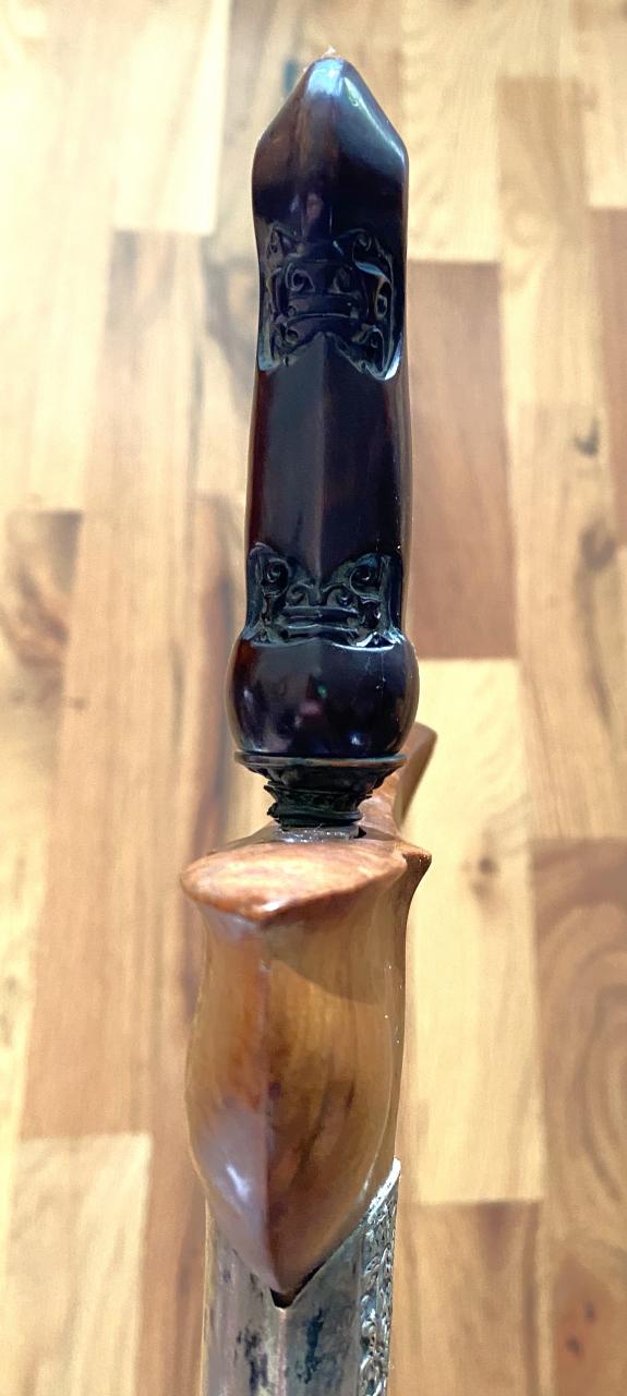 I haven't bought a keris in a long time, but I saw this for the price of a pizza and I couldn't resist. No one has posted in a few days so I thought this would liven things up. I reviewed Tammens for some clarity and this seemed to give me more questions than answers. I have studied a lot since reading him and that opened up inconsistencies I hadn't noticed before. I have a lot of questions, but few statements about this object. Is this a keris from Djogyakarta or just the dress? Dapor Sempana Kalentang? Teak burl wranka? Alas alan motif on the pendok bunton? The blade is old enough to have lost its stain, how long does that take? Overall quality. I noticed for example the "shoulders" of the hilt are slightly asymmetrical. Thanks in advance for any help and clarity the group wants to give.