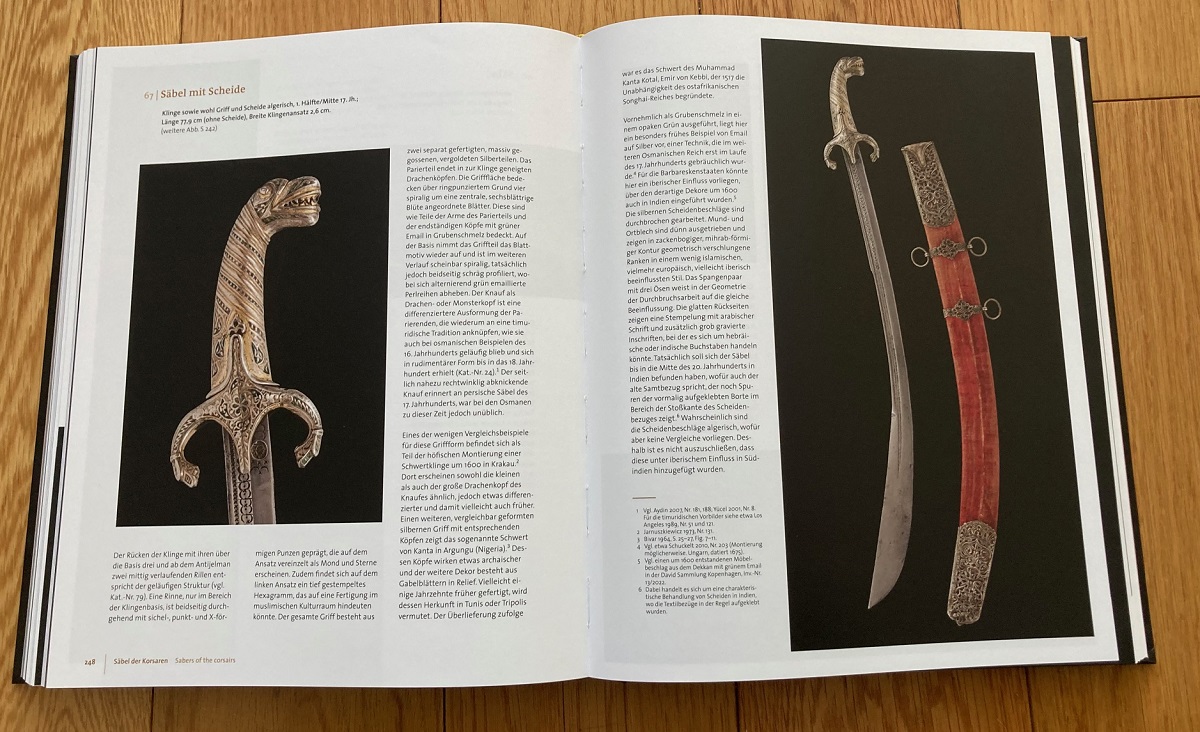 One thing I have thought in previous research on these swords is that they seem to have more commemorative and honorific value than distinct reference to the ownership and periods ascribed. As swords of state, of course they must given great pedigree, and local officials did their best to accommodate. As has been noted, this hilt seems to align with Ottoman hilt forms (yataghans pictured probably much later 18thc), and of the 16th century as were popular throughout their empire. Many influences seem to have come into this sphere, including Timurid elements as also noted. The 'dragon' feature on quillon terminals also aligns with the mythical creatures of India with the makara and yali. The 'monster' forms in these hilt quillons seem to be wide ranged in the Ottoman interpretations, from varying grotesque dragon heads to stylized versions which are more vestigial. It does seem that mythical creatures like dragons and phoenixes were popular in Ottoman styles in 16th c. (Saz style). (pictured dragon) Yucel if I recall, ascribes most of the historic Islamic blades in his references to have been rehilted in the 16th century, mostly with these kinds of hilts with downturned quillons. These type hilts were of course known in North Africa with the Ottomans who held suzerainty in Algeria, Tunis, Libya and Egypt. They are found in varying mountings including nimcha and yataghan in those regions. Naturally these types were not limited to these regions, and via trade, diplomatic relations and of course warfare and territorial tribal expansions they in degree would diffuse accordingly. The frustrating thing with study of most of these tribal states kingdoms, Sultanates etc. is that the history seems detailed through medieval periods, then typically fast forwards to late 18th into 19th century and more current geopolitical events. Therefore, without advanced study and specialized resources it is hard to assess more on these kinds of weapons of note. It would seem that the powerful trade networks through Songhai regions and the Hausa would have experienced contact with Ottoman's to the north. A hilt such as this might well have come from a diplomatic embassy at some point during the reign of Kanda Kotal, thus indeed been from the period, though I am inclined to think this hilt is later. The blade is I think as noted most likely 17th century and Italian, and such blades were known on schiavona of course. The nominal representations of the ubiquitous 'sickle' marks (generally regarded as Genoan) are seen with the singular mark, which is very much like an example from an Italian gunners stiletto c. 1650 (Wallace A858) . These are not typically taken to be makers marks though sometimes favored by particular ones, the actual purpose or meaning of them not known. They may be guild or other distinctively meant administrative symbols or perhaps even talismanic as often the case in many. All of this long winded assessment is to support what Teodor has already well observed, but adding my own details. I dont have Bivar at hand, but my interest is really piqued so could not resist. Interesting note Changdao on the Kanta 'name'. It is of course a common occurrence with these complex compound names in these cultures, where titles may be mistaken for a personal name. I'd like to know more on this as Im not familiar with regal titles in this context, it reminds me of the Pasha term in Ottoman parlance , which is of course of lesser station. |