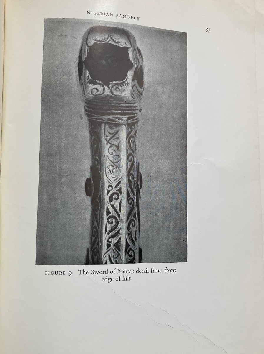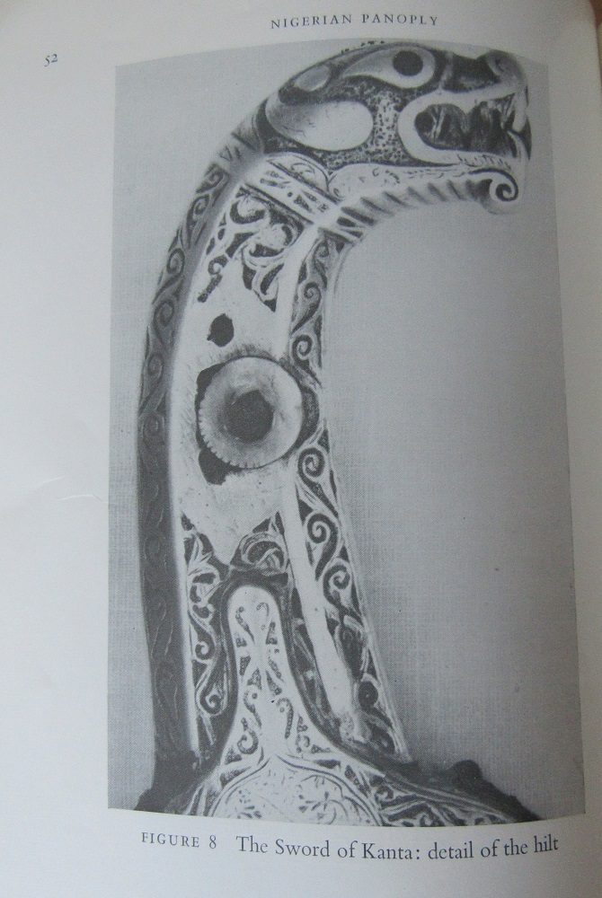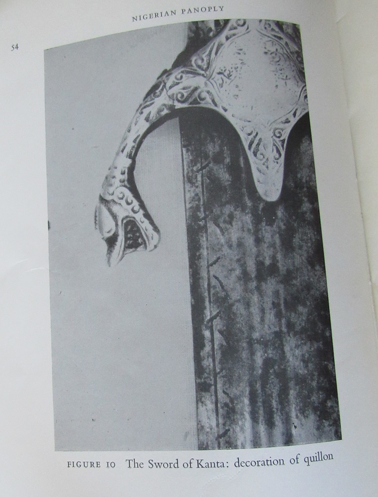 Great questions. Bivar is careful in making any general claims about the sword and simply describes it as the sword of state in Kebbi. He mentions that local oral tradition in Argungu ascribes it to Muhammad Kanta Kotal, the founder of the state, and only states that the hilt may be of sufficient age to be compatible with such a claim.