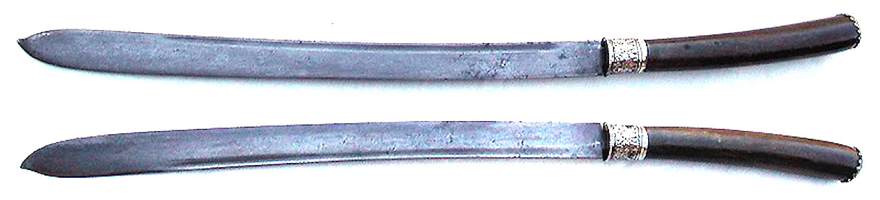 In relation to Ian's comments about "machetes", from my own experiences in the region, a variety of working knives and tools can be found, including rounded tips, square tips etc. In earlier periods larger sword like examples were common practical things to carry on a daily basis and still are in some areas. I can say from personal experience you need a good blade on you in a lot of southeast Asia for the simple necessity of moving through the terrain let alone the host of other practical applications required throughout a day. Of course with silver fittings yours Marc would be more upmarket, but the point is that there is a thin line sometimes between a dha being only a weapon and being a tool as well, although I think yours is very much on the weapon side of things. |
