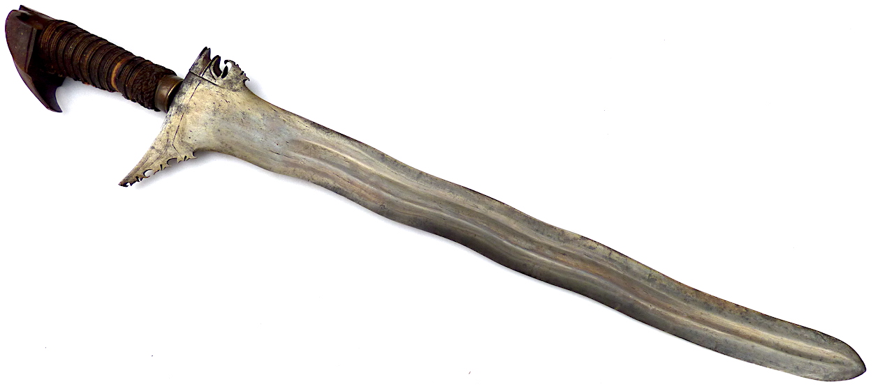 This backwards feature occurs so frequently that it is unlikely to be a mistaken mounting by an ignorant collector. These seem to be deliberate arrangements that occurred mainly in the second half of the 19th C. Here is an obvious example of such a kris. The hilt has been mounted backwards and the kakatua crest has been amputated rather crudely. The blade is well forged, with hardened inserted edges, and of good quality. It is well balanced and the fullers on each side give it a slimness and "lightness" that make it easy to wield. I believe this blade shows a strong Malayan influence, with the long central fullers running down the blade almost to the tip. Attachment 249273 If the kakatua pommel were in its correct orientation and two baca baca in place, I think this sword would have been dressed originally in a Sulu or a Brunei/Malaysian Borneo manner. The question arises as to who changed this sword and why? I believe that the vast majority of these transformations occurred during the last period of the Spanish-Moro wars. In the latter part of the 18th C the Spanish and Moro groups had fought each other to a draw. The Spanish could not maintain garrisons in Moro territory at that time and decided to withdraw. This state of armistice persisted into the 19th C until steam-powered gun boats were adopted by the Spanish and this tilted the balance of power. The Spanish could now effectively patrol coastal and inland waterways and could maintain coastal and riverine outposts that were defended and reliably provisioned. Spanish-Moro hostilities thus resumed in the last quarter of the 19th C. I believe that it was at this time that 19th C kris were captured by Spanish military units, and some of the better quality swords were converted to a more European version. This involved altering the blade orientation by reversing the hilt. Moro kris have a downward blade tilt while the reversed blade has an upward tilt, more closely resembling the shape of a saber that may have felt more familiar in the hands of a European-trained soldier. Thus, I think we can date many of these reverse-hilted kris to the last quarter of the 19th C. The removal of the crest on the pommel may have been done either to accommodate the different orientation of the blade or perhaps a larger European hand. This custom may have continued under the subsequent American occupation and their conflicts with the Moro groups. I don't have any information to suggest that is the case, but it seems possible. . |