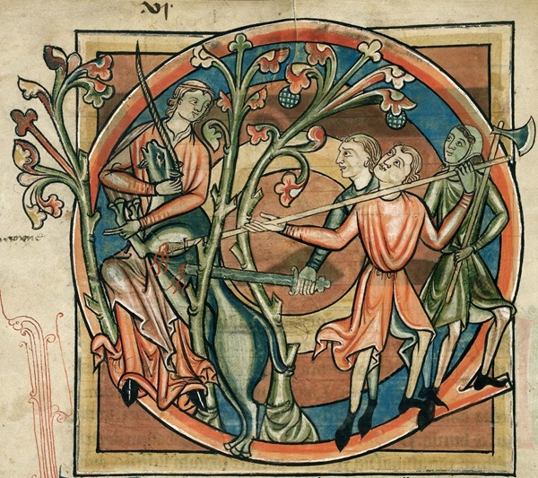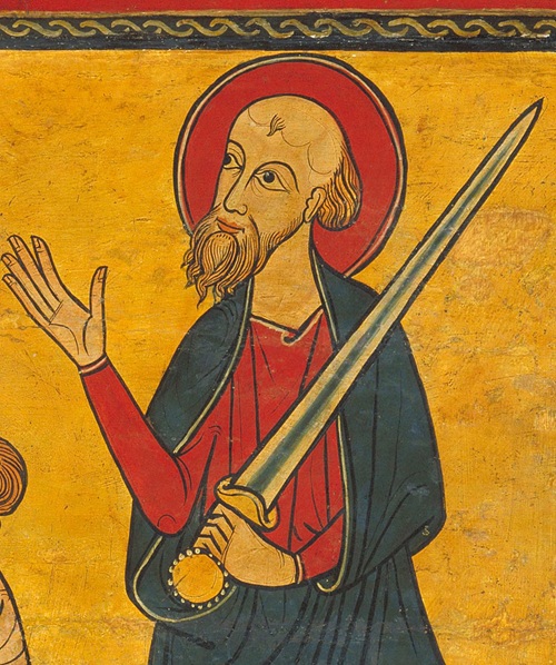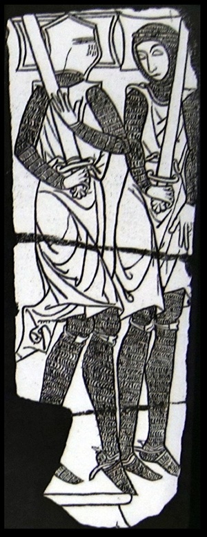 Paintings and miniatures of this period from France and England sometimes include depictions of trefoil pommels, sometimes in combination with the curved guards also seen in Spain (and the Jerpoint stone above).