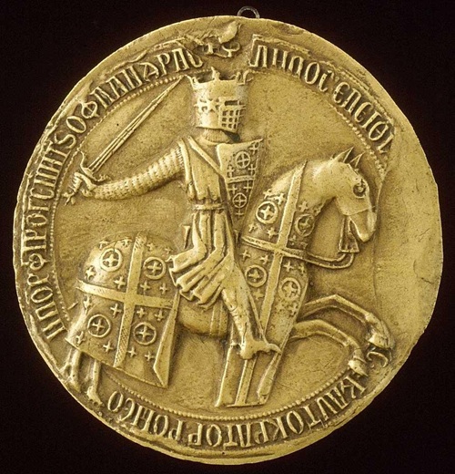 Attachment 251271Attachment 251272 13th and 14th century seal matrices are a good source for hilt variants. Among these, the seal of Charles of Anjou is perhaps the the clearest depiction of a fleur-de-lys pommel, as befits a member of French royalty. The seal and coins of the Latin emperor, Philip of Courtenay are similar. Attachment 251273Attachment 251274 Attachment 251275Attachment 251276 Particularly in Italian art, the trefoil form is sometimes abstracted and more resembles three conjoined discs or globes. This style also seems to be shown on some seals, like that of James III of Mallorca. Attachment 251277Attachment 251278Attachment 251279 Attachment 251280 (continued below...) |