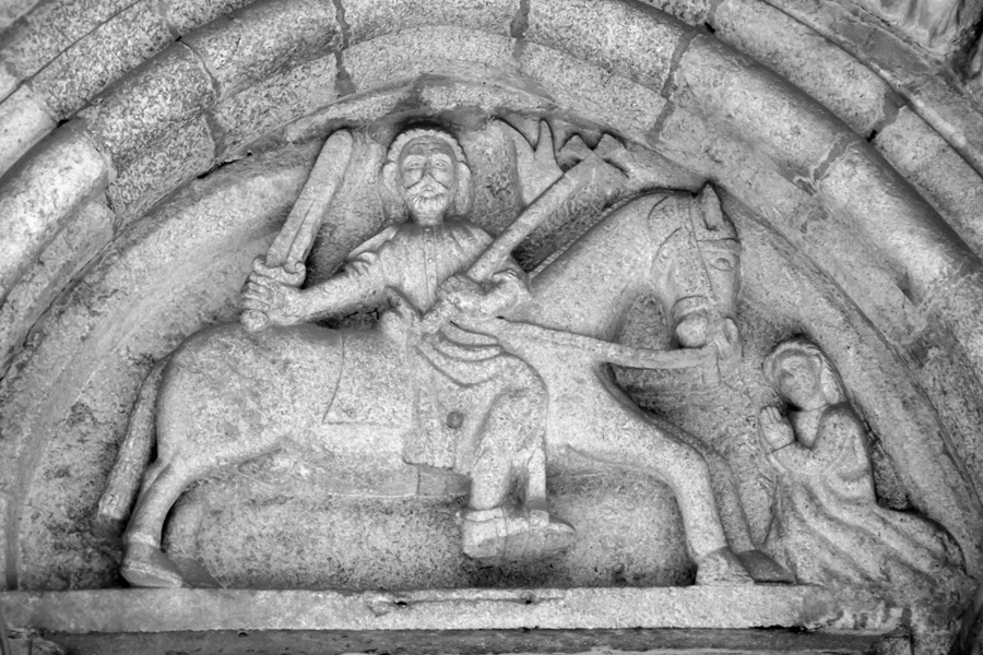 Swords with elaborately curled guards often appear in Spanish art, more often with discoid pommels, but lobed forms appear too, as in the effigy of Prince Felipe of Castle (d. 1274). Usually the curvature is towards the blade, but the reverse is also seen, as in the Alluye effigy.