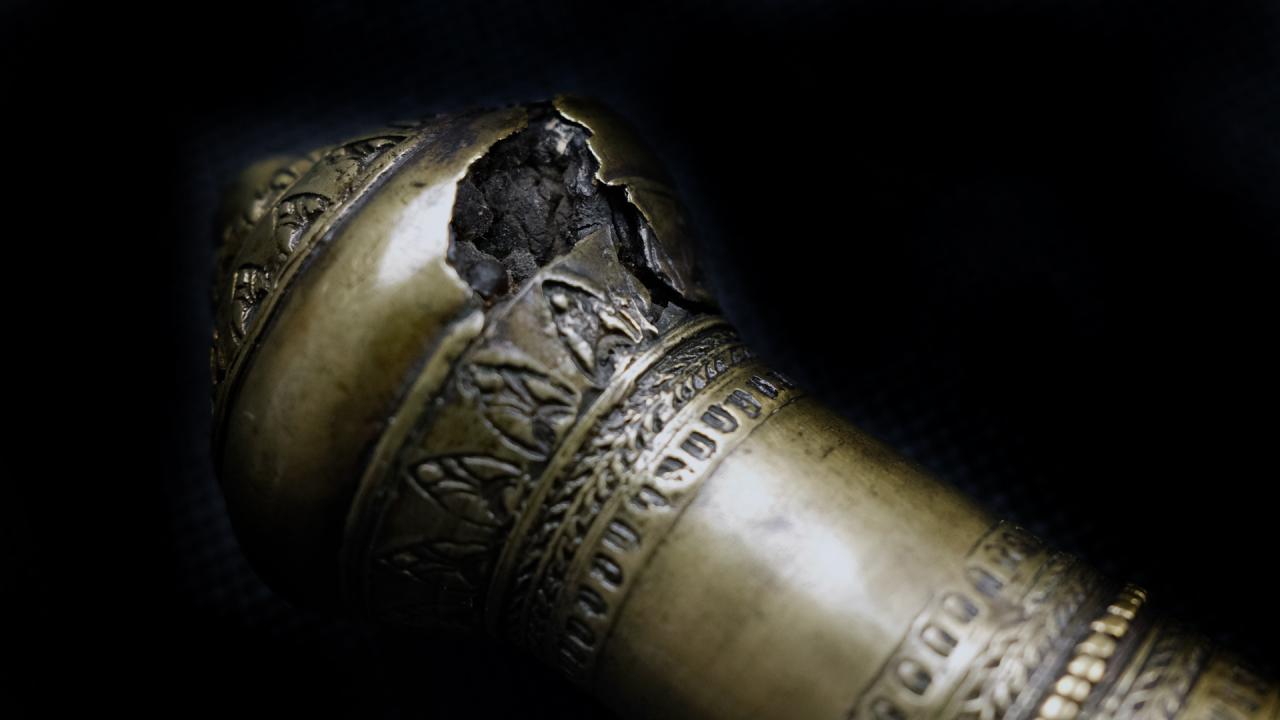 The hilt is cast using the 'lost wax' casting method, quite often the metal used in Laos or Thailand was a mix and not just brass and can also include gold, known as samrit. Resin or ki’tai in Thai, made from the gluta usitata tree, is used not only to secure the blade to the hilt, but also to attach elements like the pommel. You can see in this case the entire pommel was filled with the resin. There was likely a flaw in the casting on this piece that was then probably aggravated by expansion from humidity in the hilt. But it does at least let us see the "guts" of the sword.