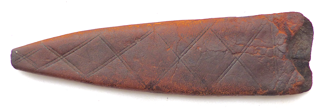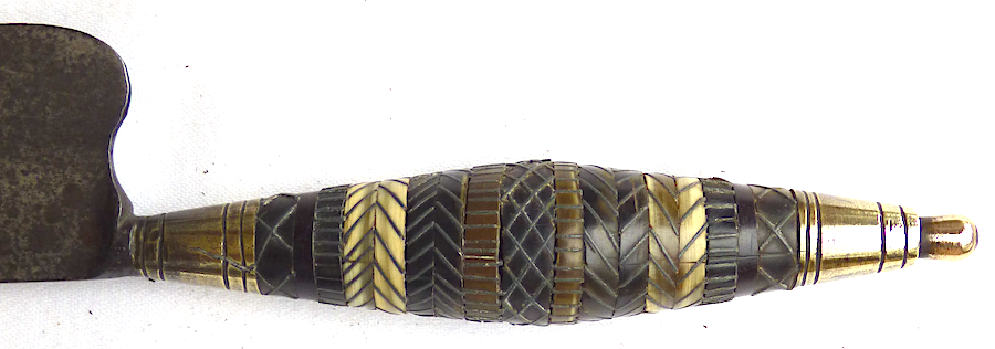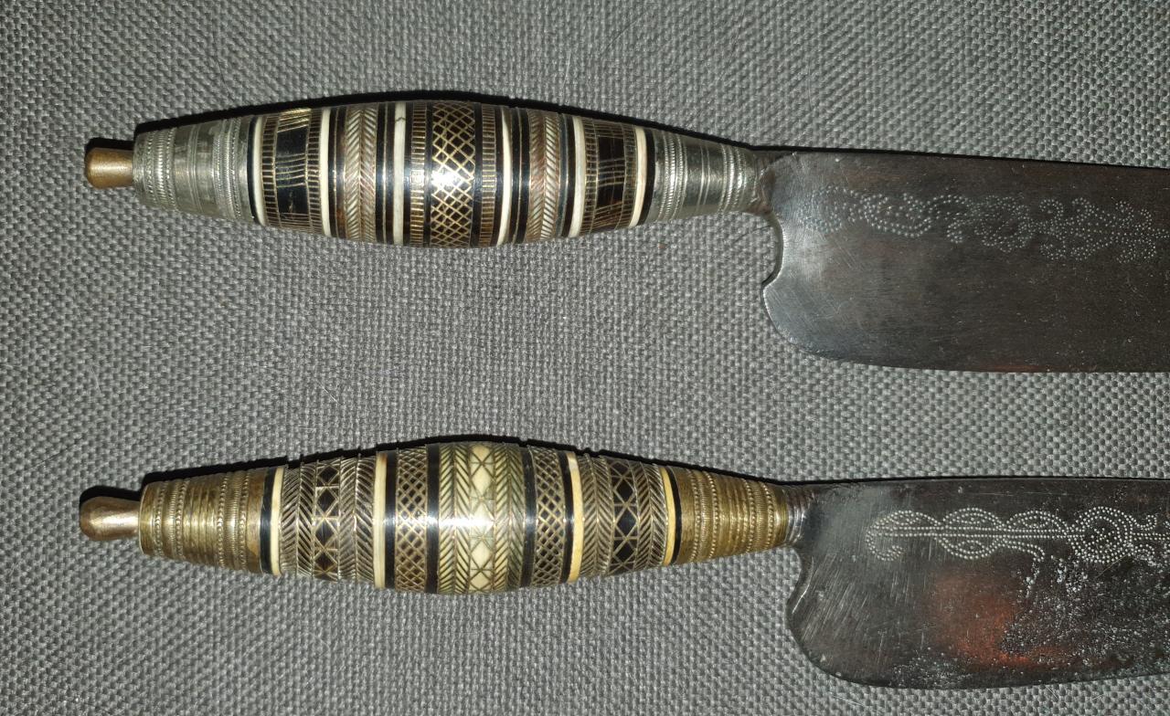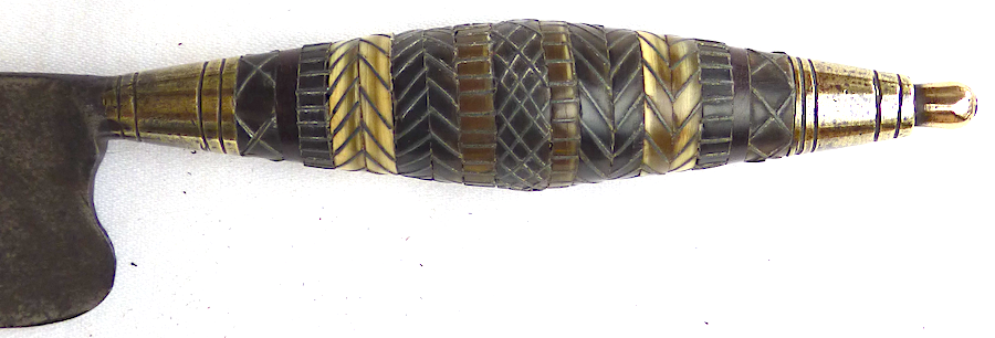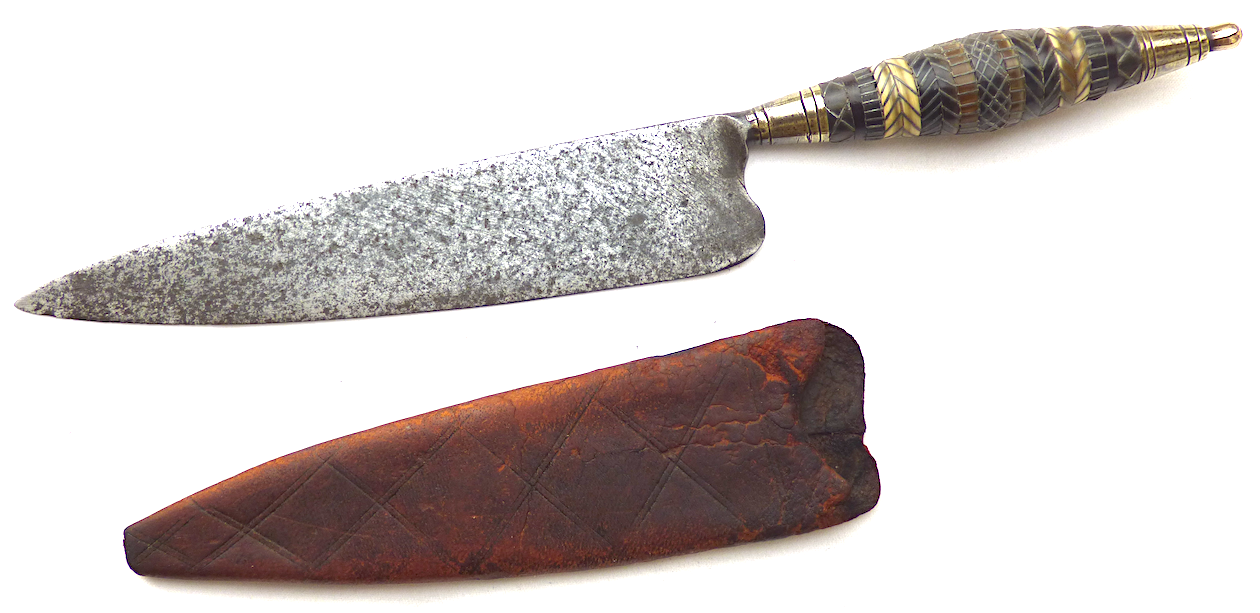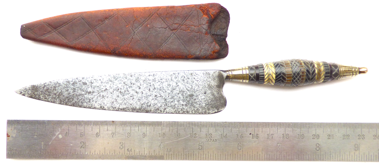 Knife 1. An example similar in size to the one I have shown in the original post of this thread. A single edge blade 5.5 inches long, dot punched decoration on the one side. Hilt composed of alternating discs of horn bone and brass. Total length 9 inches. Very good condition. No scabbard. Knife 2. A single edge blade 6.5 inches long and 1.5 inches wide, dot punched decoration on the one side. Hilt composed of alternating discs of horn bone and brass. Original leather scabbard. Total length 10.5 inches. Very good condition. Knife 3. A single edge blade 7 inches long, dot punched decoration on the one side. Hilt composed of alternating discs of horn bone white metal and brass. Total length 10 inches. Very good condition. No scabbard. Last edited by Ian; Yesterday at 11:33 AM. |