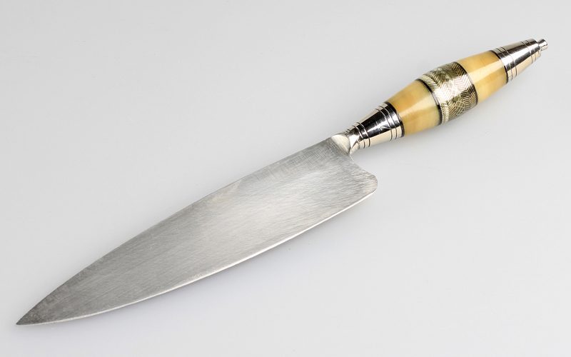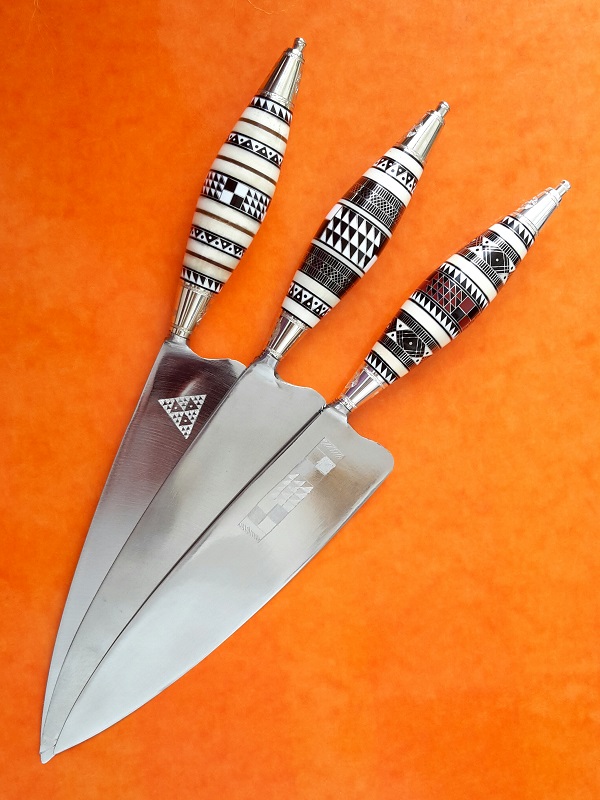 It is interesting that the author refers to British contact, and hence the transliteration of the English word "knife" to naife to describe the Canary Island form. I believe this British contact related to trips made back and forth between England and India during the 19th C and earlier. British ships, both merchant and passenger, would stop at the Canary Islands for provisions before proceeding down the African coast and around the Cape of Good Hope into the Indian Ocean. ------------------------- The naife is, without a doubt, the star product of Canarian craftsmanship. This knife has been for centuries a basic tool for the farmer and the Canarian rancher. Today, it has become a valued decorative element from which exquisite pieces longed for by the best collectors in the world are made. History of this work of craftsmanship On the history and origins of the Canarian knife much has been said, but little has been studied and written. The most accepted theory is that the naife is a knife of Albacete origin modified by local artisans to meet the needs and tastes of the Canarian man dedicated to the work of the earth and, in particular, of the banana trees. Its name is clearly derived from the word used in English to refer to a knife, "knife", the Canarian English naife would only have the name. This is because he has not found any piece of the British knife industry that can be related to the unique morphology of the Canarian knife. Other theories relate the Canarian knife to Berber culture and the Canarian Guanches or Aboriginals. Some specialists claimed that the Canarian knife came from North Africa, but this theory has been losing weight in recent years. The Canarian masters of the 21st century keep alive an ancestral tradition that has adapted to the new times without losing their value and cultural roots. The workshop, materials and tools have practically not changed, but the final product is used more as a decorative element, either in the form of an abbreads or miniatures, than as a tillage instrument. The naife: how this work of craftsmanship is manufactured El naife or Canarian knife is composed of three distinct parts. A large blade, pointed but rounded and wide in shape at the opposite end, which extends into a piece called a spike [tang], which is where the round section handle, which is called the cape [hilt], is embedded. In the knives made for work in the field, hardened steel blades are used, while in purely decorative ones, silver or alpaca [German silver] leaves are used. The materials for their elaboration The materials used for the handles are the ram’s, goat, and cow’s horn, ebony, ivory, and metals such as silver, steel or alpaca. The material chosen is prepared in circular rings with different diameter that are subsequently joined to give the handle its characteristic round shape. In these rings are made some incisions and purely decorative inlays that form the plant, chess, or geometric figures chosen by the artisan. The elaboration of the naife The elaboration of the naife is divided into two parts, on the one hand, the manufacture of the sheet [blade], and on the other, the elaboration of the handle. With the exception of some master knifemen who manufacture the complete knife in their workshop, it is usually that the blade is made by blacksmiths while the knifemakers are dedicated exclusively to the corporal [hilt]. The process of elaboration and ornamentation of the cape is very complex, since it is necessary to prepare circular pieces of different diameter to give it its characteristic circular shape, assemble the metal washers that join them, and make the curious inlays that make unique each artisan Canarian knife. If you want to know more about the instruments and the Canarian craftsmanship we leave below several links that may be of your interest: The legacy of traditional Canarian ceramics; Timple, know the history of the Canarian instrument; The Canarian draft, insignia of island crafts. |