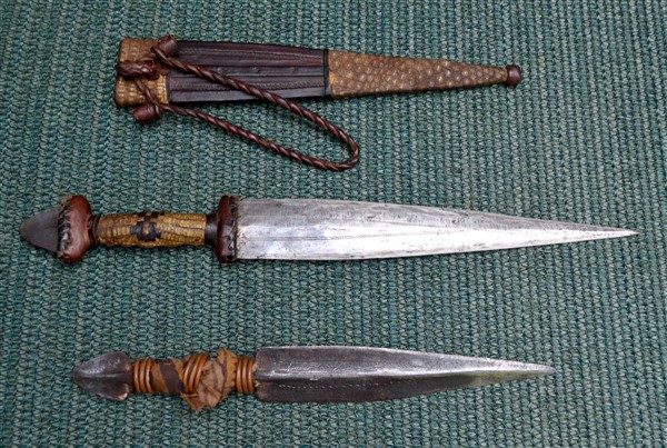 Shown are what I believe to be 2 Tebu daggers. The larger one with the scabbard and the reptilian wrapped handle appears to be the newer of the two. The blade almost looks as if it had been cut out of metal and shaped.