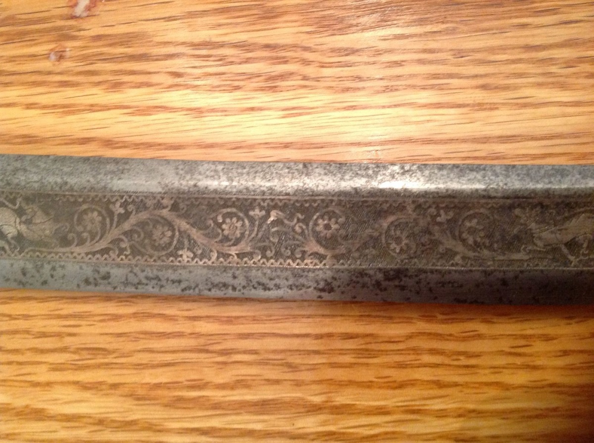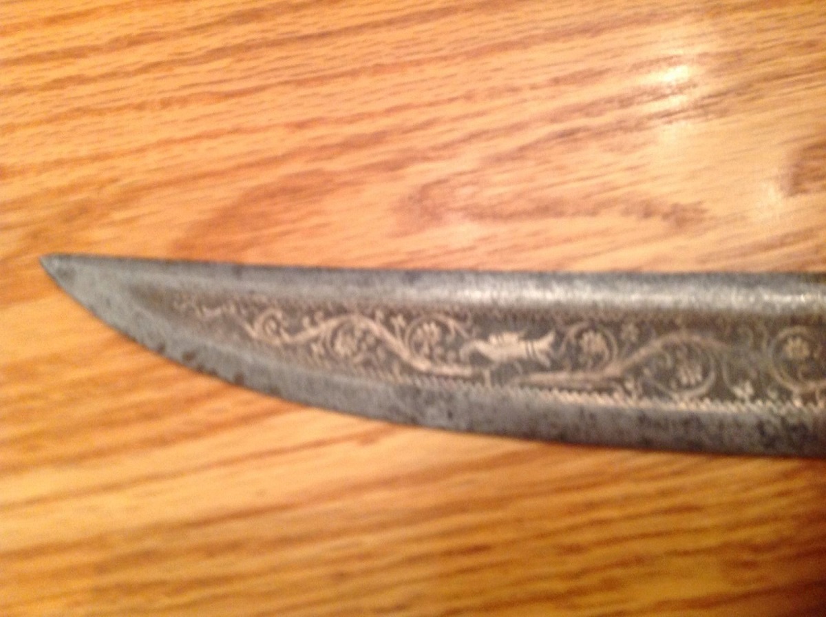 Here is an interesting example of what I found out to be a Burmese Dha Iwe (Story Sword). The wooden handle is missing some parts. IMHO the ray skin cover and the silver pommel!?!, while the tiny brass nails are still there, as well as a silver part on the lower part of the handle. The blade has most of it's silver koftgari intact, which is beautiful, done masterfully and is done inside the wide fuller. Part of the spine of the sword near the handle is also covered in koftgari.