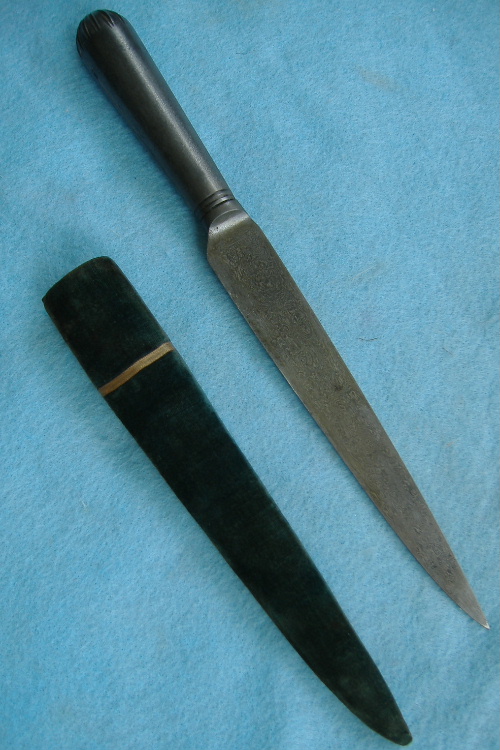 I suspect the scabbard is later. I may be rethinking my ideas about "blingy" weapons! Dimensions: Overall 11.5in. Blade: 7.25in. Comments and opinions welcomed. |