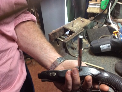 I do a good bit of home repairs on firearms, in ireland a few flintlock and percussion guns come up at auction and go for big money, what tend to sell for cheap are weapons needing a bit of work which is totally understandable. I used to steer away from those guns but a while back I got a lovely Brown Bess in perfect condition but the hammer was shorn off and I took it on as a project. The screws holding on the side plate were completely seized Below is method used to remove screws Gun in question is a 1830 percussion pistol, lot of issues but got it at a good price and it is nice to have a project Step one is grind screw driver till a perfect fit in the slot Then put into lathe and push both parts of lathe together to ensure the driver head can not slip out of the slot in the screw Very gently rock the chuck and screw will come out, I find actually tightening the screw initially gives better results As screw is being un screwed move part of lathe back to ease pressure, Result as I hope you can see is screw out Always soak the part in diesel before to get some penetration of the metal to ease the removal Has worked for me loads of times, if no lathe a pillar drill can be used to same effect. Hope pictures below explain process. I have loads to do on the gun but will document and update as things progress Regards Ken The picture of me with punch is final removal of the side plate so is out of sequence |