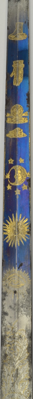 Here’s an odd one. This Naval dirk has the most usual etched design I have come across, appears almost free mason. It’s larger than most of my dirks and I haven’t come across another example quite like it. I would be interested in anyone’s thoughts as to what this peculiar collection of symbols might mean. Date: c1800 Overall Length: In Scabbard 20 ¾” 52.5 cm, Dirk Only 20” 50.8 cm Blade length: 15 7/8” 40.3 cm Blade widest point: 1” 2.5 cm Hilt widest point: 2 ½” 6.4 cm Inside grip length: 3 ½” 8.9 cm Marks, etc: St Side Floral design, seeing eye, Sun, Moon & Stars, Scull & Cross bones over a coffin, Hand, Foot. Other side Floral design, Star, Maltese Cross, Sheep with Flag, Rooster, Sword. Description BRITISH OFFICER'S BLUE & GILT DOUBLE EDGE DIRK:16" blade retaining 70% blue & gilt finish; gilt brass hilt Lion's head pommel & with chips to carved ivory grip; fitted with original gilt brass chain; complete with gilt brass mounted leather scabbard. c.1800. Any thoughts Cheers Cathey & Rex |