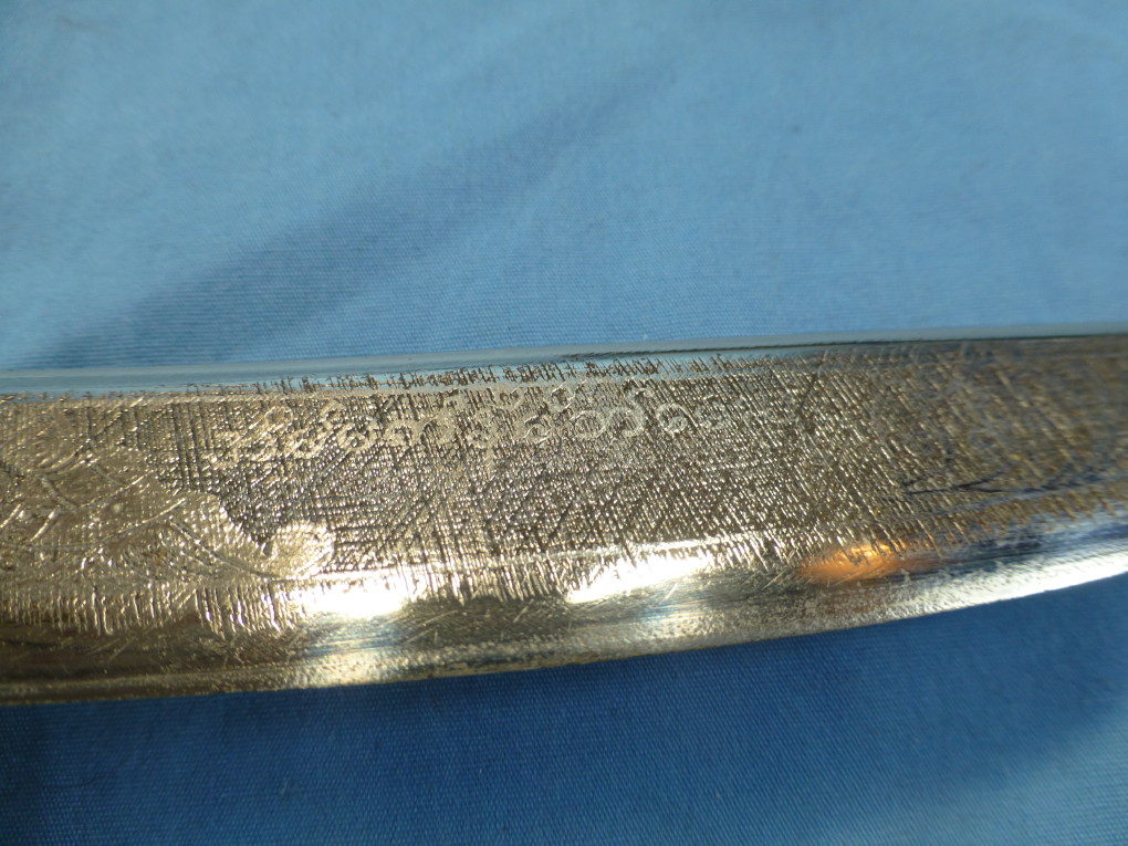 I attach new pictures of this sword. An unusual, and not very effective, technique was employed to decorate the blade. The surface was scratched and cross hatched. Then it appears that an effort was made to polish letters and images into the roughened surface. The effect is not very striking. It is difficult to bring out the images even by eye, and nearly impossible with photography.