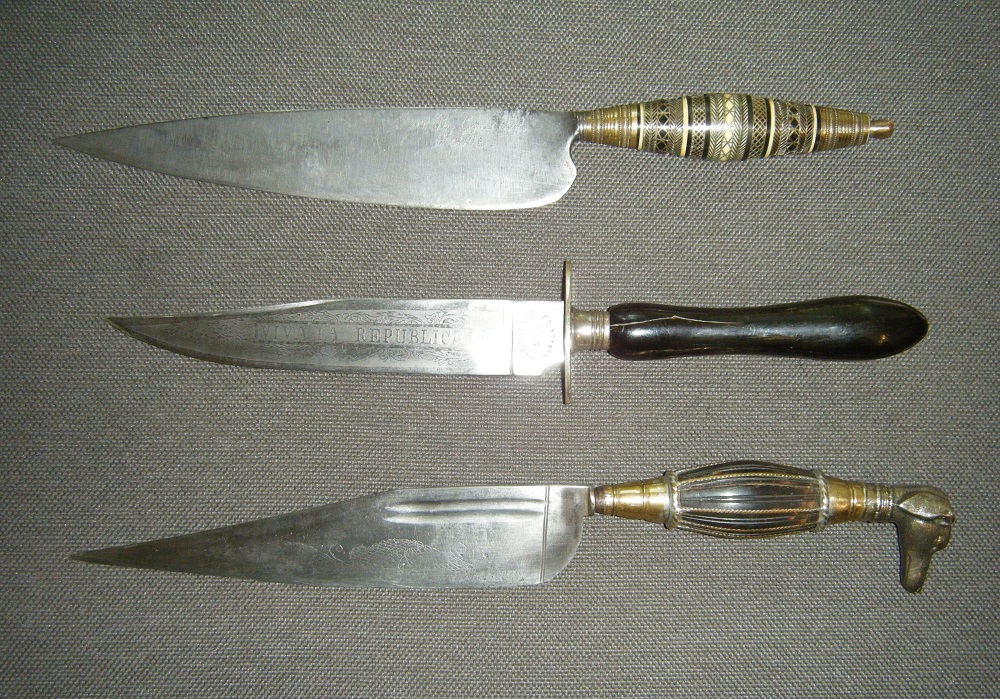 With a little google search I found this: https://books.google.de/books?id=j2U...acaibo&f=false In short it was a German trading company from Hamburg and going to Venezuela and worked from Maracaibo. So I guess that the knife is from possible Solingen manufacture but like said, it's only my guess. Guard is from brass, ferrule iron, handle from horn, blind tang. Scabbard is very worn and from leather and worked in a fahion we know from other South American knives/daggers. 26,5 cm overall without scabbard 14,8 cm blade only 5 mm thick near the handle |
