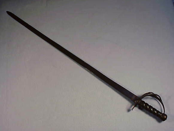 I spent some time yesterday photographing this beautiful sword. It has been suggested that it would best be described as a Spadroon rather than a Backsword, that it is likely British from the late 18th century, and that the ring indicates naval use. It has a half-basket hilt with what looks like a Horn or possibly Ebony grip. The overall length is 38 1/8 inches. The blade is 31 7/8 inches long and 1 2/8 inches wide where it meets the guard. It has a false edge that is about 5 1/4 inches long. At its widest point, the hilt is about 4 1/2 inches wide. I haven’t been able to locate any makers marks.