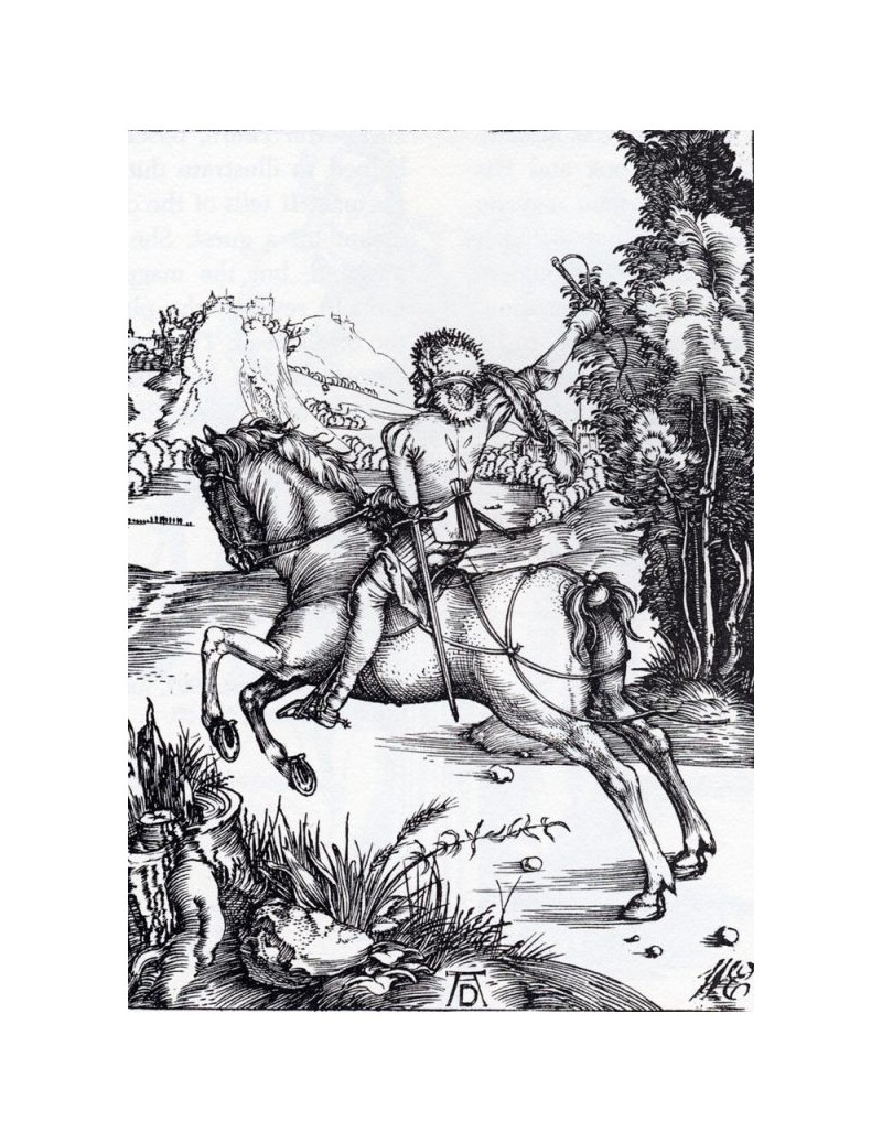One of the more well known of Durer's work, and one that has been posted more than once elsewhere on this forum. Good detail on the sword, armor, horse's tack, etc. A well executed piece, all around. |