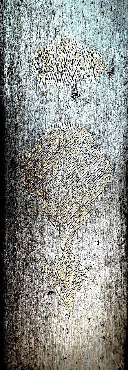 The picture of the Cartouche has been enlarged so much it looks like the blade has been overly cleaned however this is not the case. I think the camera picks up scratches that are not visable to the naked eye. The blade is plain, but apparently that is not uncommon for this type of Tulwar. I have since been advised by a collector who specilises in this area that the shape of the hilt and the floral decoration place it as Punjabi. The cartouche looks to be Islamic, and he has seen a similar cartouche previously which read "there is no sword greater than the zulfikar, and no greater warrior than Ali". I think the Cartouche has simply rubbed away with age, but confess it does look quiet grainy when blown up as I have done here. This sword came to me with a second one of Sikh origin that also has a plain blade. Cheers Cathey |