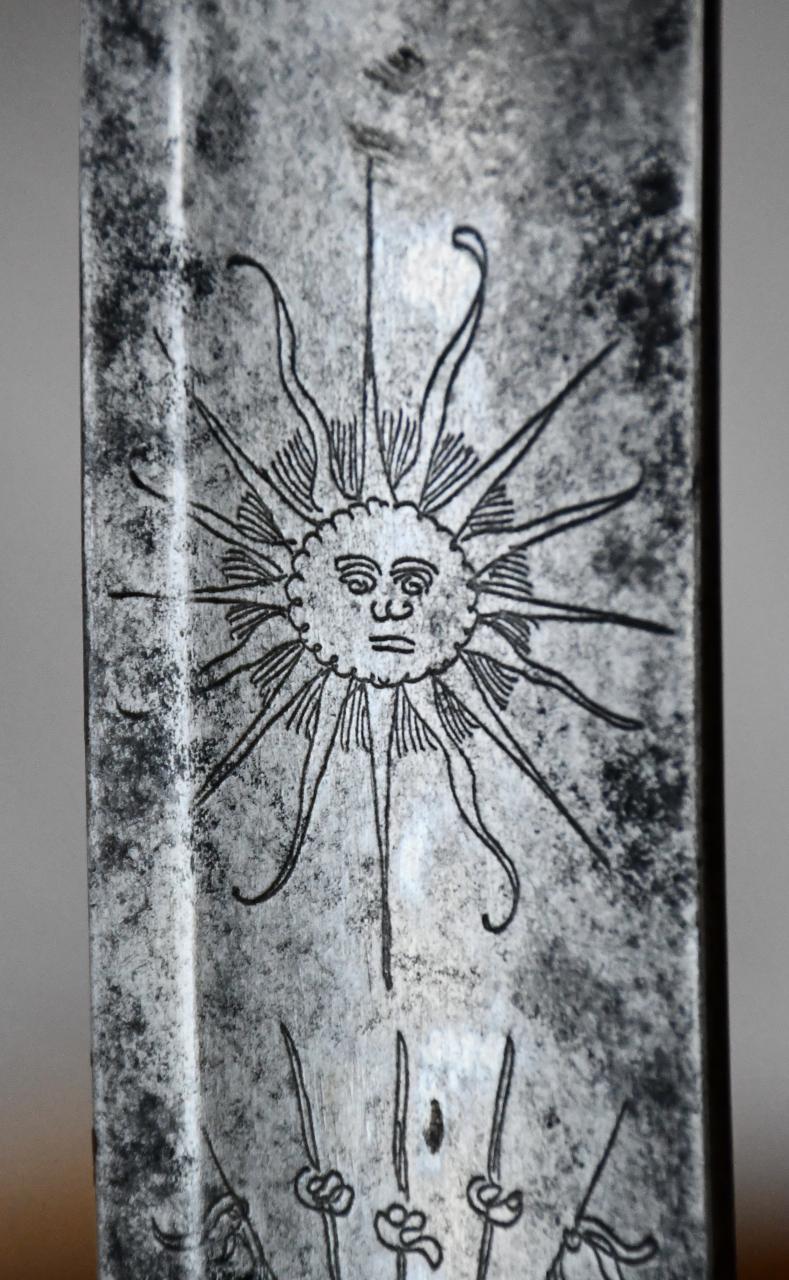 The Turks head, magic/occult symbols and devices were meant to further carry this mystique in the overall esoteric character of the sword. While these kinds of decorative devices are familiar from East European swords, they were also popular in French swords where elements of troops from these places were often factored into French forces. |