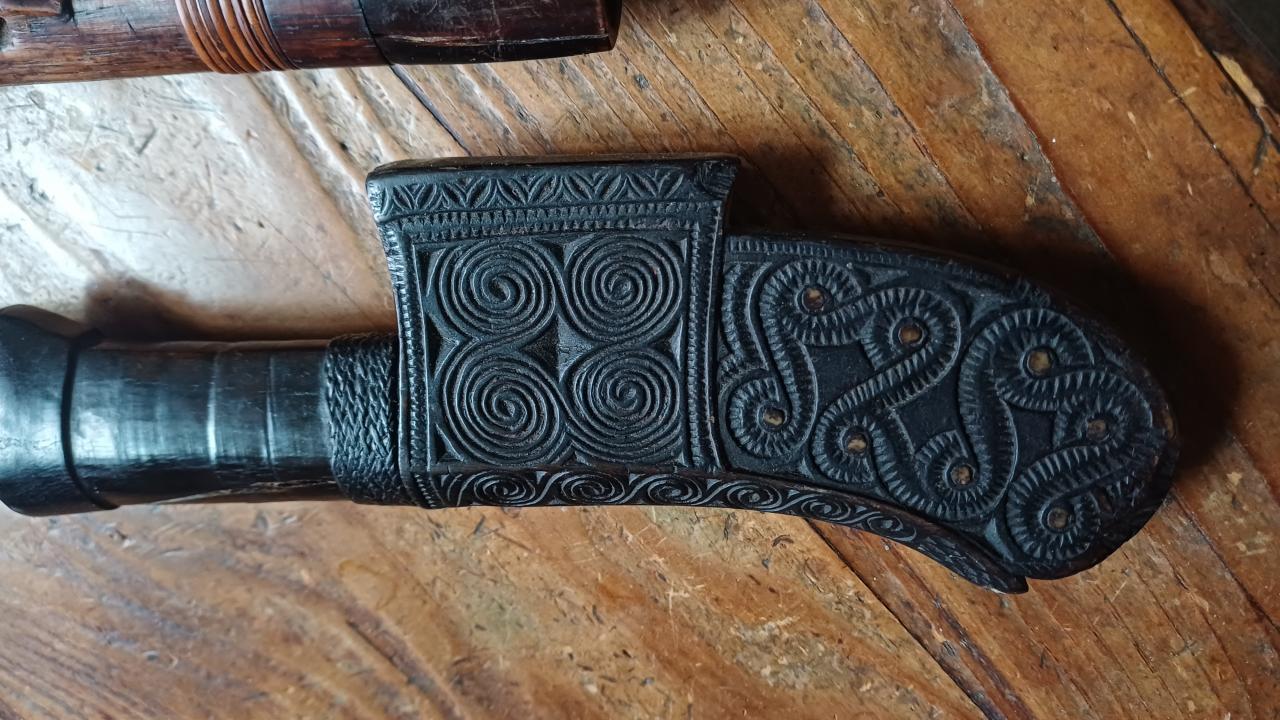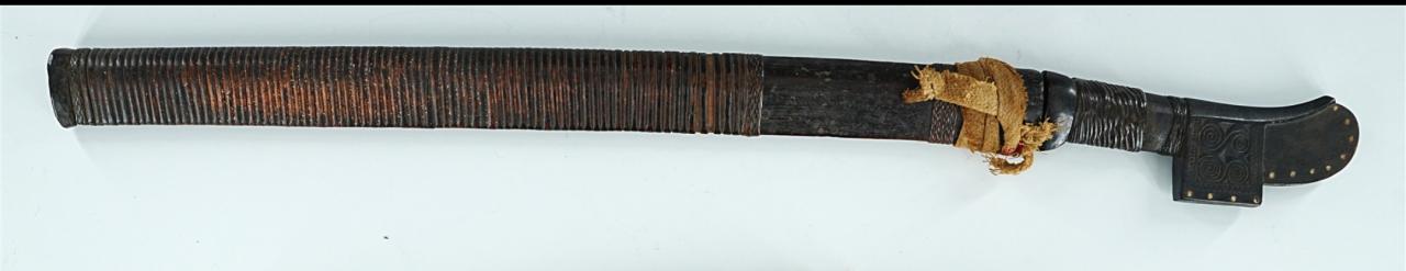 Here is a subject to exhibit your Dua Lalan The first has a very simple wooden handle, the scabbard is covered with rattan with a brass band at the base. The second has a pretty buffalo horn handle inlaid with bone, unfortunately it lacks the rattan on the grip and mice we seemed to find it to their taste ... The foot of the scabbard is in buffalo horn and is maintained by a bone pin. |