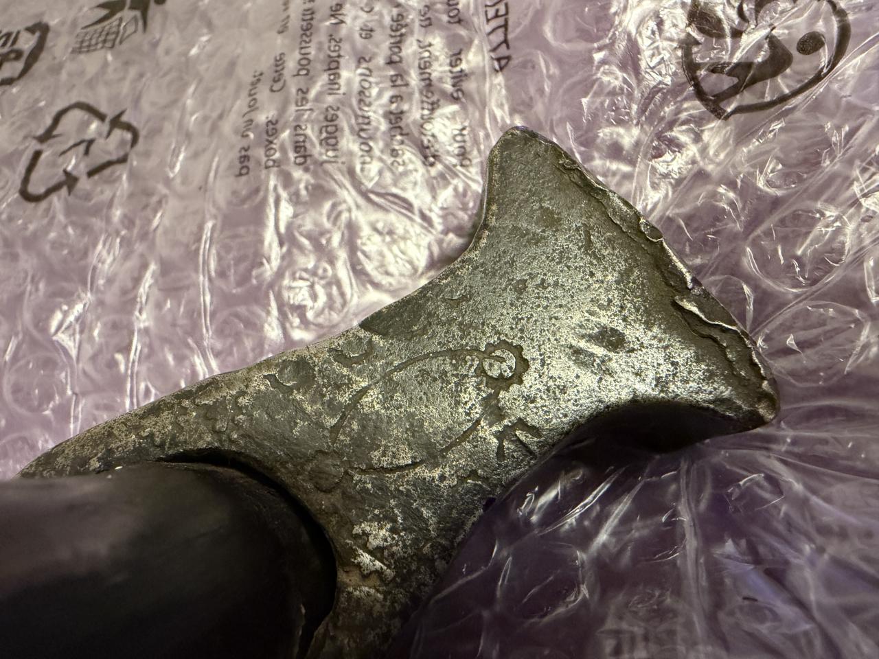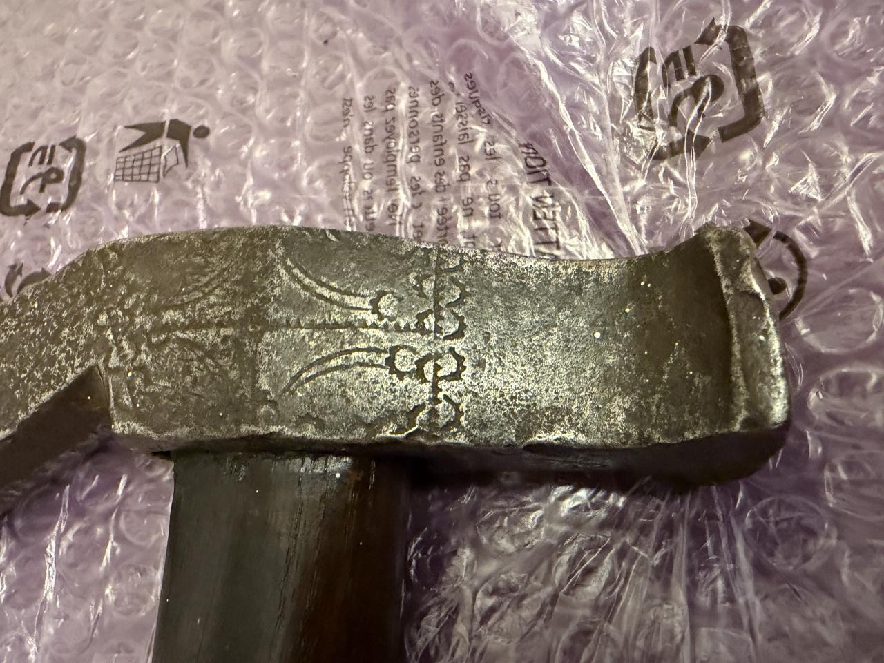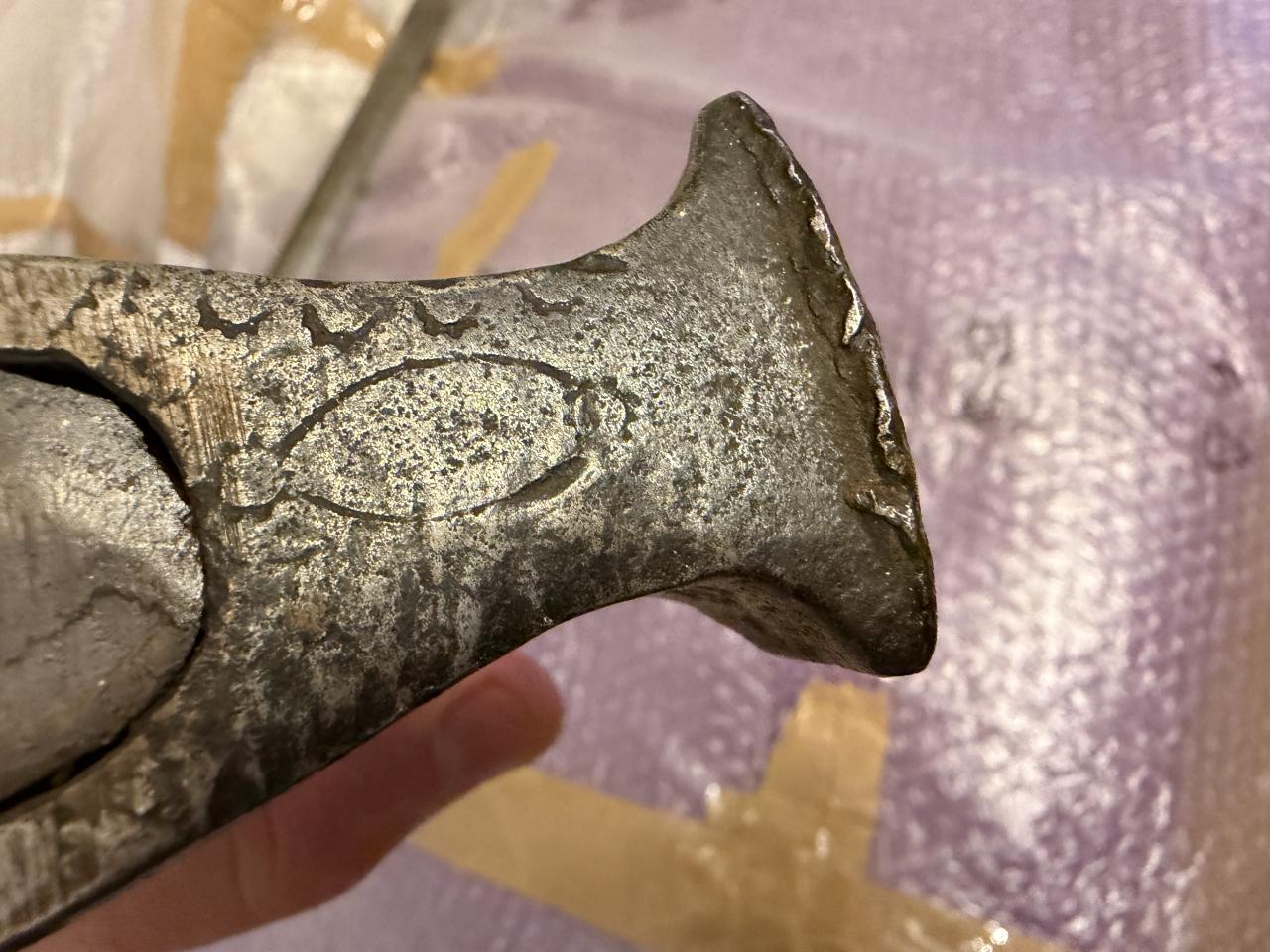 I found in Milan Praunsperger book Weapons of old Croats similar axe it is caled Balta, it looks similar. Handle of the axe is definetly not original from the period, axe is very well made, tempered, it has engrawings, some of them looks like Italian marks ferrara used, arches with sun. It was rely nicely decorated but that deteriated over time. If someone knows origin or something about it? |