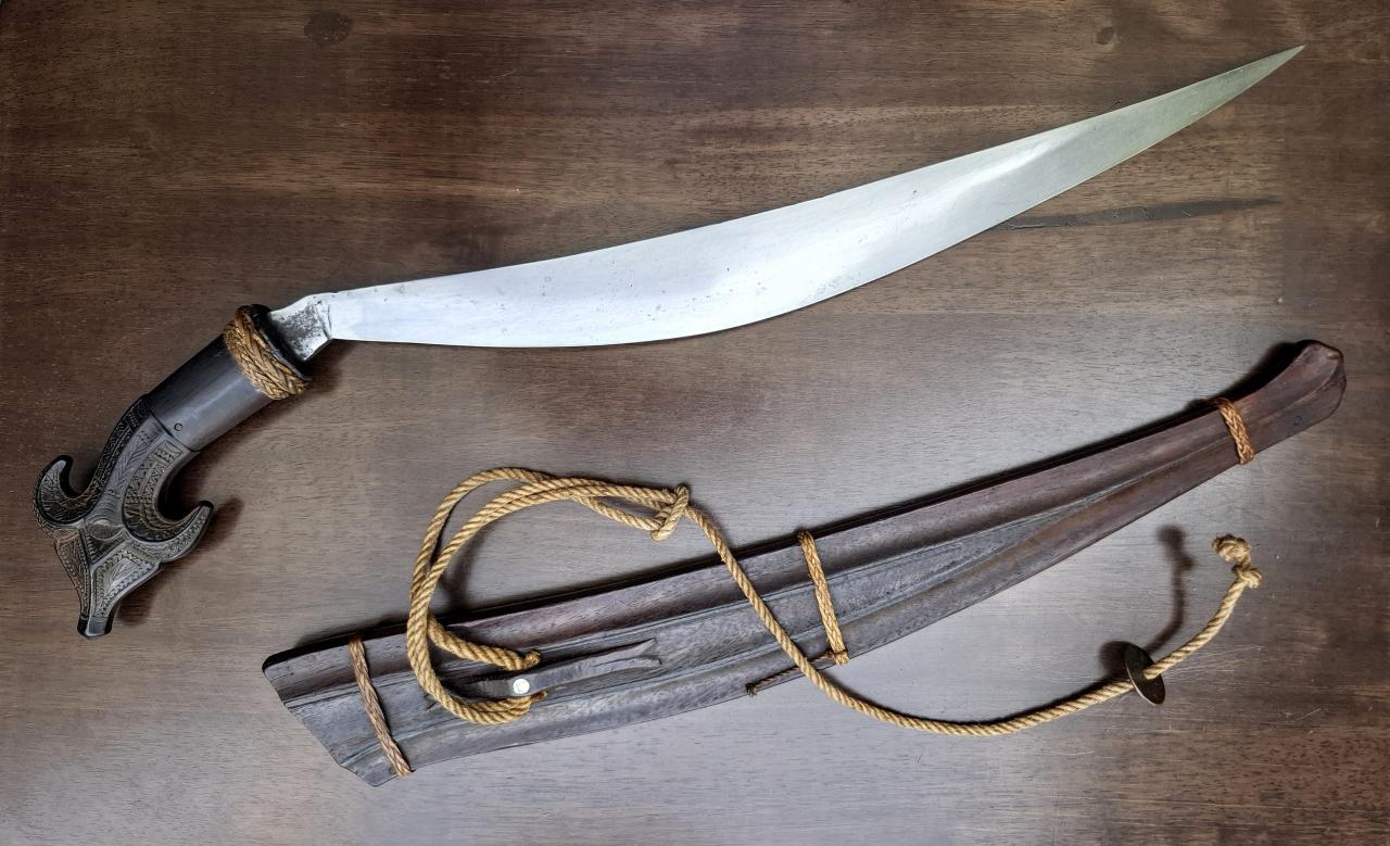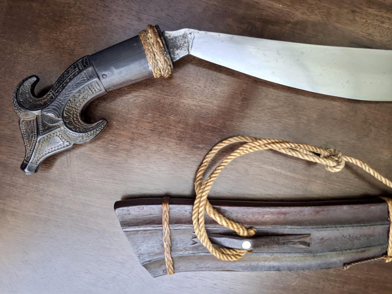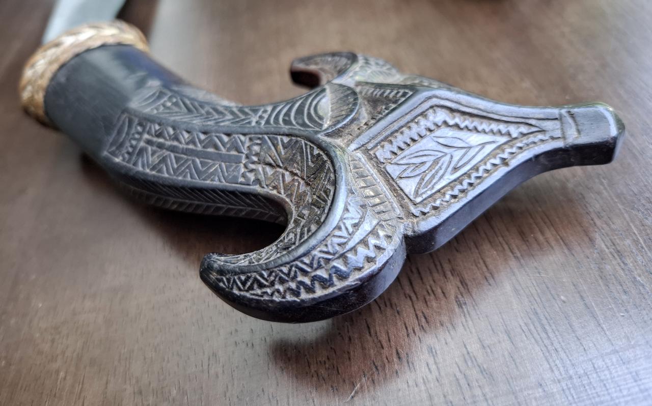 It has the typical triple fullered blade you see on Moroccan nimcha and lots of other swords from around the world and horn grip scales. The shape of the grip looks a lot like those of Bedouin swords, but it's missing some of the decorative elements that are typical for the group, so I'm not quite sure. Do you think this is an accurate identification? For reference, here's the type of sword I'm thinking of: |