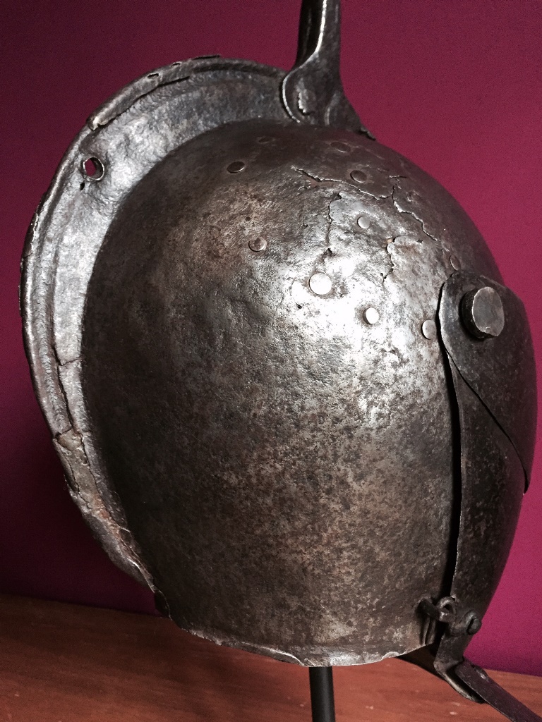 Funnery achievements were earlier on components of the actual armour of the deceased. These later examples are interesting in their own right for a sometimes different reason in that they are often made from odds and ends of original functional components and quickly ginned up elements. Jean's example seems to be made from elements of 17th century cuirassiers helmets. The bowl was damaged, the front made from two non matching components ( this visor clearly was intended originally for a helmet with a much more pronounced chin ) appears to be from a different helmet than the bowl as the flange carrying the gorget plate on the front sits considerably lower than the flange ( which has been cut away ) on the bowl of the helmet would have been ( as the back gorget plate goes under the front gorget plate when the helmet is closed and one this obviously would not be possible the these elements ). This is a nice classic example of a later funnery achievement of the 17th century made up from original components from several other helmets.