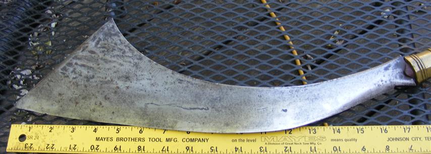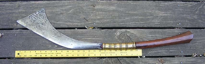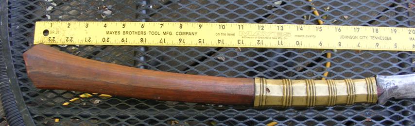 My new birthday panabas. Very heavy blade that is over 1/2 inch thick at the hilt. The hilt has a heavy cast brass collar and two cracks in it probably from shrinkage (one on top of the hilt and the other on the bottom) but the piece is still very stable. The wood of the hilt for some reason looks a lot lighter in the pictures than it actually is, probably the lighting. This is a heavy piece weighting in at 4 lbs 6 ounces. What I would really like to know is if a panabas like this would have been used mainly as a weapon or as a tool. Thank you in advance for any comments on this piece that anyone would like to make.