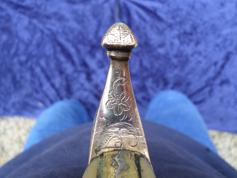 Here is a shamshir with a walrus ivory karabella style handle. Gold engraved crossguard. The backstrap has silver filigree with three round coral stones on the end. The blade is of Kara-khorassan type wootz, 26 inches long, 31 1/2 inches overall. Unfortunately, no scabbard. The small dimensions make me wonder if it might have been made for a boy. Someone told me that the cartouche says the maker is Assad Allah but I think this blade is one of many later ones that was signed with his name to make it more saleable. I would really appreciate a translation on this sword if possible............Dave.