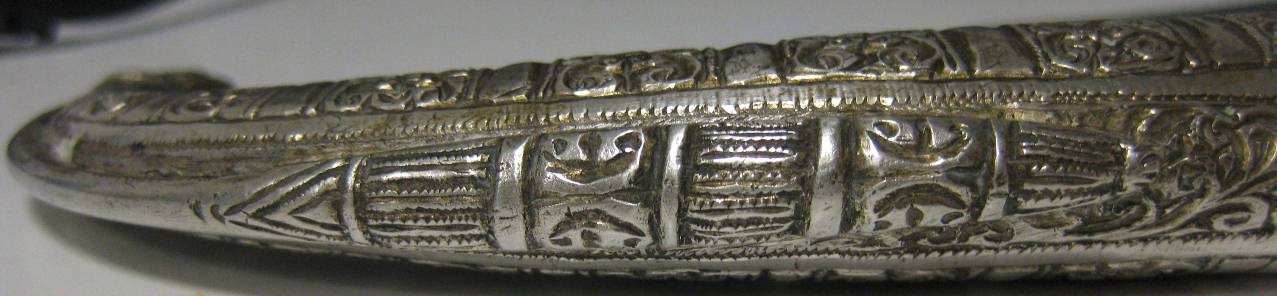 I picked this little guy up recently thinking it was a run of the mill koummya with a nice blade and a missing ferrule. The scabbard appeared to brass in the auction pictures so I got it very cheaply, but after scrubbing at it with some toothpaste it turns out it's silver. There's 3 marks on the ricasso on one side. The lower two appear to be 0's that may have had something inside of them, while the one above appears to be a circle with something written around it. It's too worn down to read. Does anybody recognize it? I assume the blade's of European origin.