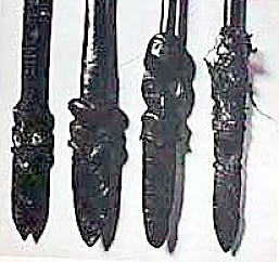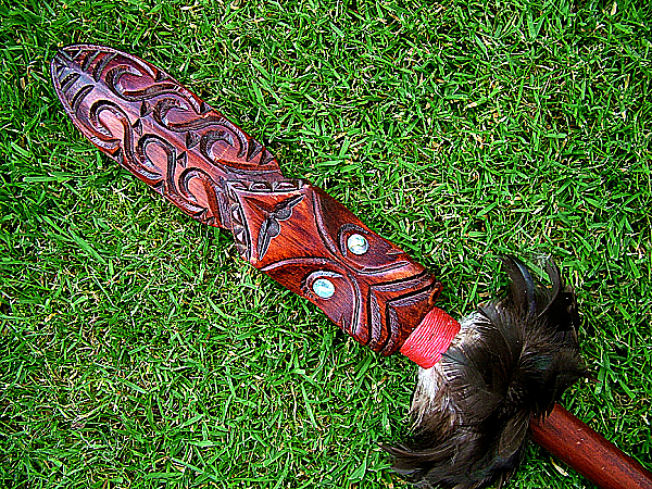 THERE ARE SEVERAL TYPES OF MAORI LONG WEAPONS THEY ARE MADE MOSTLY FROM WOOD BUT SOME ARE MADE OF WHALE BONE. I WILL START WITH THE MOST COMMON FORM THE TAIAHA OR TAHIATIA . IT IS A LONG STAFF WITH A POINT AT ONE END AND A WIDE FLAT STRIKING END. THRUSTS AND STRIKES ARE MADE WITH THE WIDE FLAT END WHICH IS THE PART OF THE CLUB USED THE MOST IN FIGHTING. THE SMALLER END NEAR THE GRIP IS OFTEN CARVED WITH A HEAD WITH A TONGUE STICKING OUT WHICH FORMS THE POINT. THIS CAN BE USED FOR THRUSTING BUT DOES NOT FORM A SHARP SPEAR POINT. OFTEN FEATHERS OR DOG HAIR IS ATTACHED JUST ABOVE THIS CARVED FACE, THIS IS SAID TO HAVE BEEN USED TO TAUNT THE ENEMY AS WELL AS TO SHOW STATUS AND BE A DECORATION.