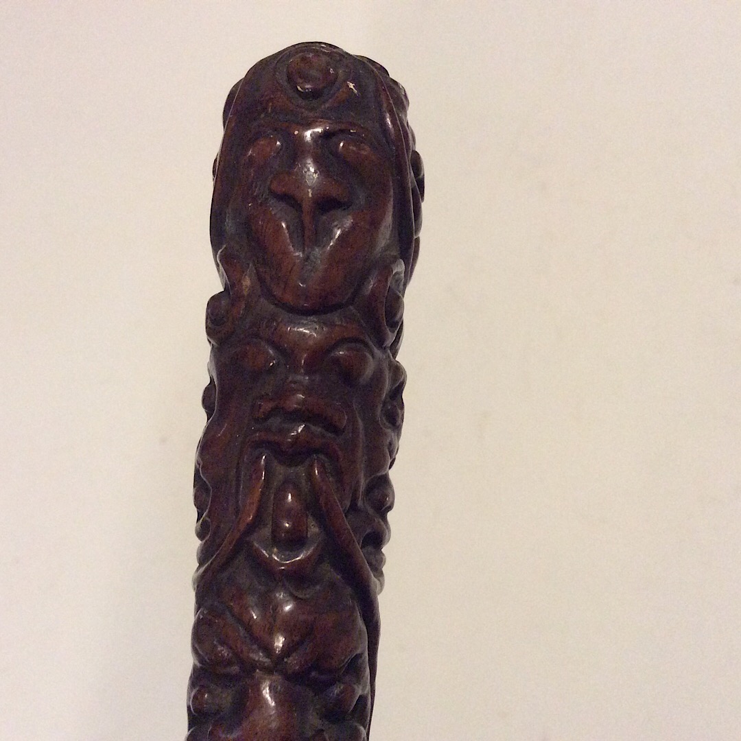 Rick, I would defintely agree with your discerning eye in estimating 17th c. blade, probably Low Countries and of course this places it in the VOC sphere. The artisans in Ceylon and Java were magnificent carvers and they produced many hilts for officers on the VOC and this seems a blade mounted in the manner of a pedang (though obviously much larger). We know Europeans had a penchant for novelty and exotic things which these trade networks provided. The style seems to me very much baroque (as suggested by Rick) as popular in England and Europe in mid 17th c. with what seems the 'green man' and other such figures. |