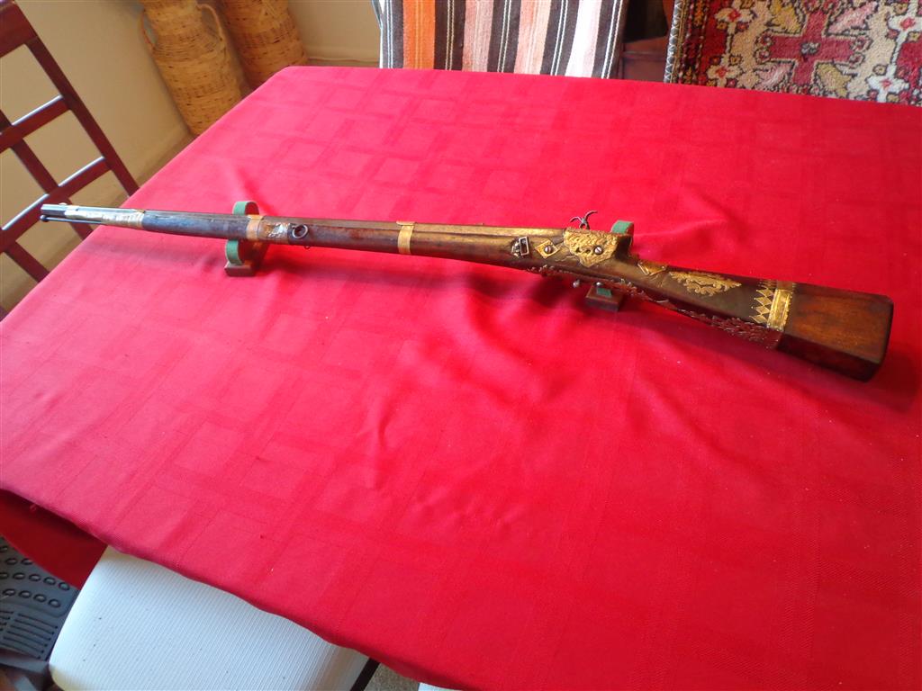 Herre is a Link on the Forum where I originally posted this gun - 4 years ago ! LOL If you view the earlies photos you will see disastrous condition this gun was in when I first acquired it (for next to nothing) http://www.vikingsword.com/vb/showthread.php?t=20353 At that time I had restoration work done including: New smooth bore steel barrel liner installed, lock cleaned, re-worked and tuned, brass overlay around the barrel tang replaced. So far, so good. But the stock had a large crack in the wrist area. Also, this is one of those Ottoman long guns that show up with a very short length butt stock that you occassionally see. And this one had a brass butt plate on the end. But I was convinced that this stock originally had a longer section of butt stock as most others. So, I acquired a a large piece of European walnut and sent this and the stock to fellow Forum member Philip Tom for repair and restoration. There is a sliver of wood missing from the right side of the forearm. But nothing we can do about that. The barrel is not original to the stock and was likely a Balkan period replacement. A couple of period repairs remain. The butt stock addition was correctly shaped and refinished with an antique look to match. You can't even tell where the large wrist crack was. LOL The gun now looks 1,000% better. And is now - finally - finished and ready for test firing. Maybe Philip can chime in on this Thread with some comments. I'm sure this was a challenging project for the stock. Needless to say, I'm super happy with the outcome. (Thank You Philip!!) Meantime, here are a bunch of pics of the finished shooter: Rick |